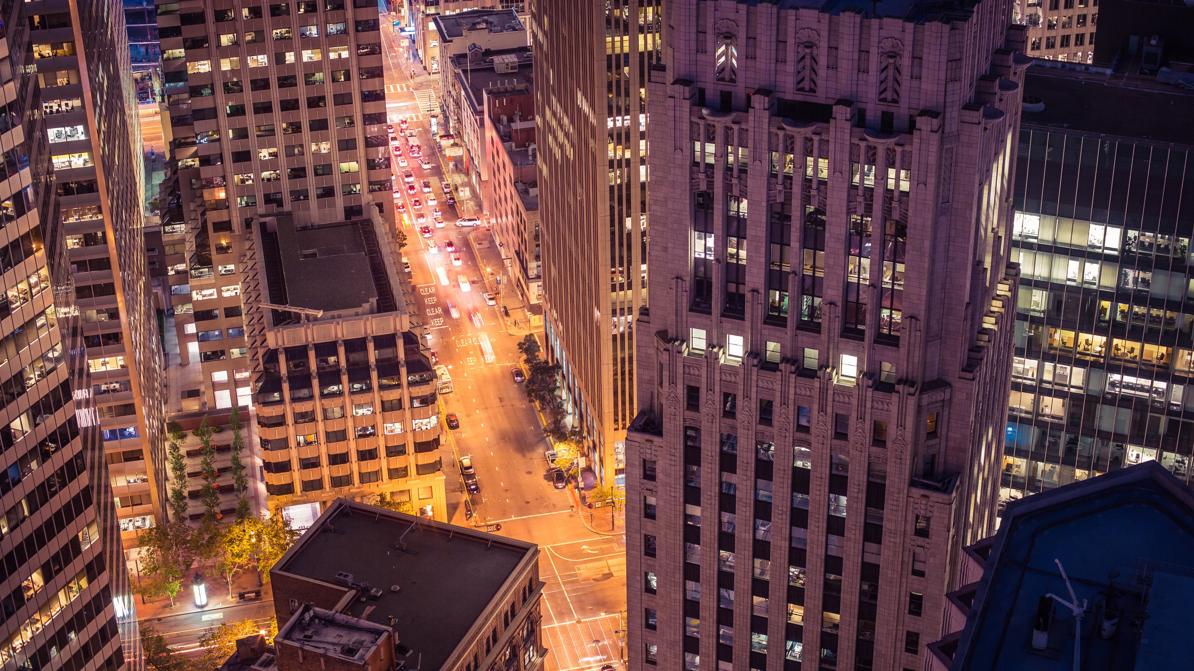Description: A city street at night with tall buildings and traffic lights on the street and a lot of traffic on the street.