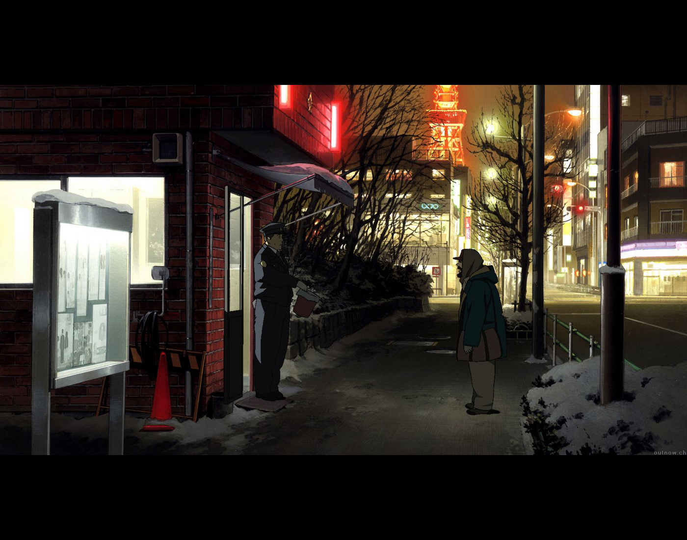 Description: A woman walking down a sidewalk at night with a red light on the building in the background and a person standing on the sidewalk.