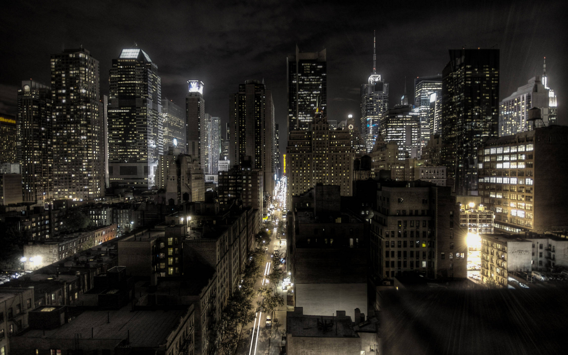 Description: A city at night with a lot of lights on the buildings and the sky in the background is dark.