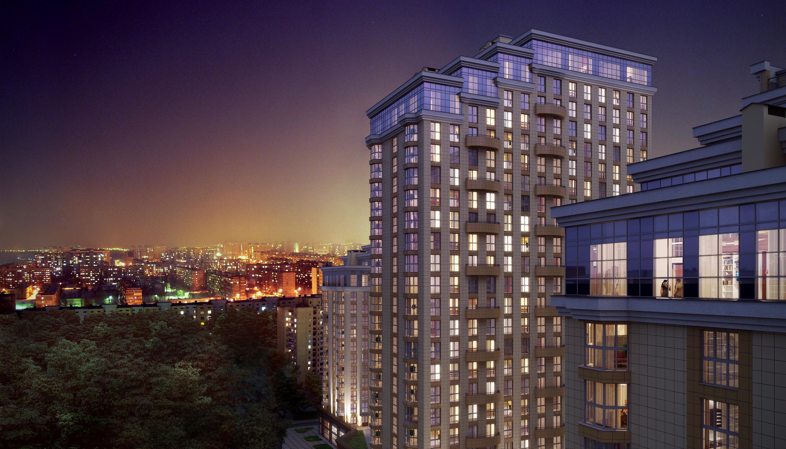 Description: A night view of a city with tall buildings and a lot of windows and lights on the windows and the city lights in the windows.