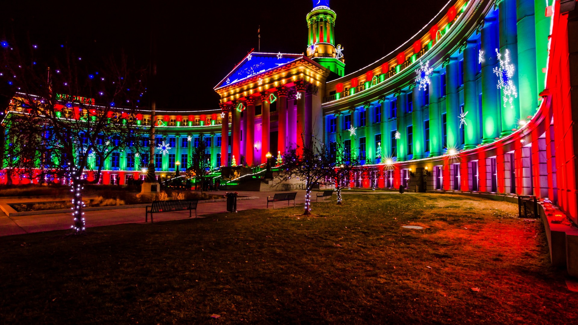 Description: A building with a lot of lights on it at night time with a clock tower in the background and a lot of lights on the ground.