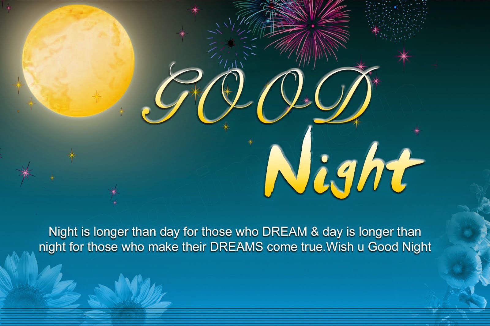 Description: A night scene with fireworks and a full moon with a message that says good night on it.