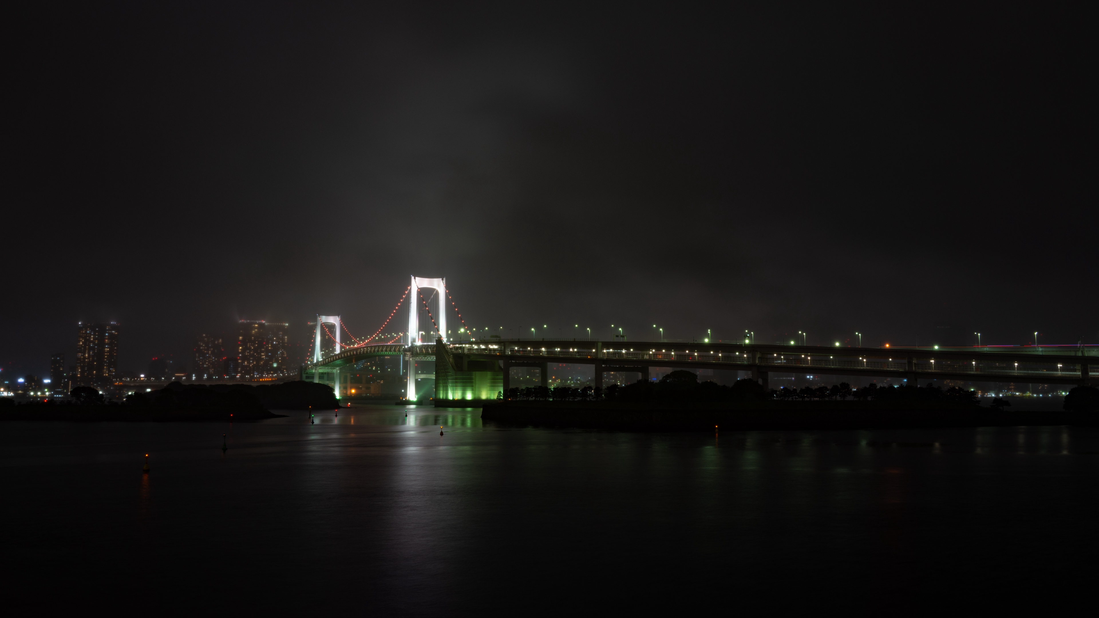 Description: A bridge that is lit up at night with lights on it and a city in the background with lights on.