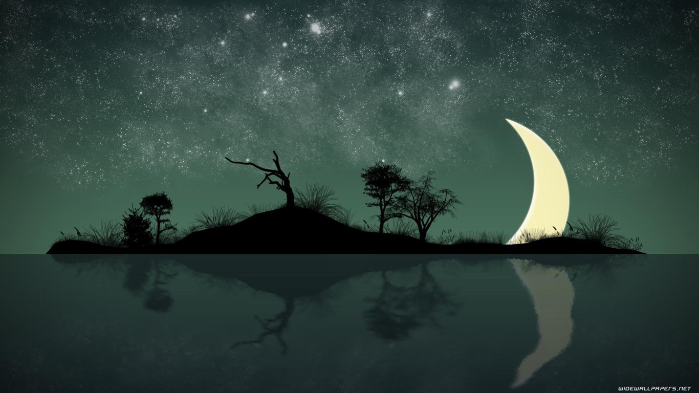Description: A night scene with a half moon and trees on a hill with a lake below it and stars in the sky.
