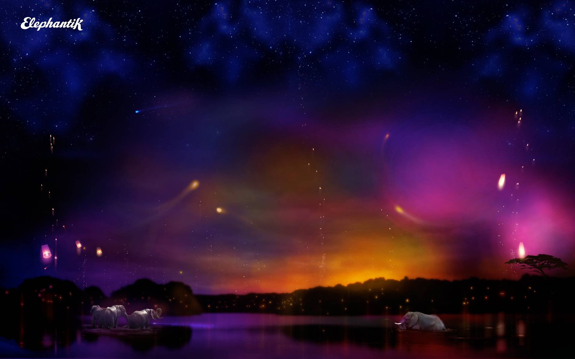 Description: A painting of a night sky with a lake and trees in the foreground and a few lights in the background.