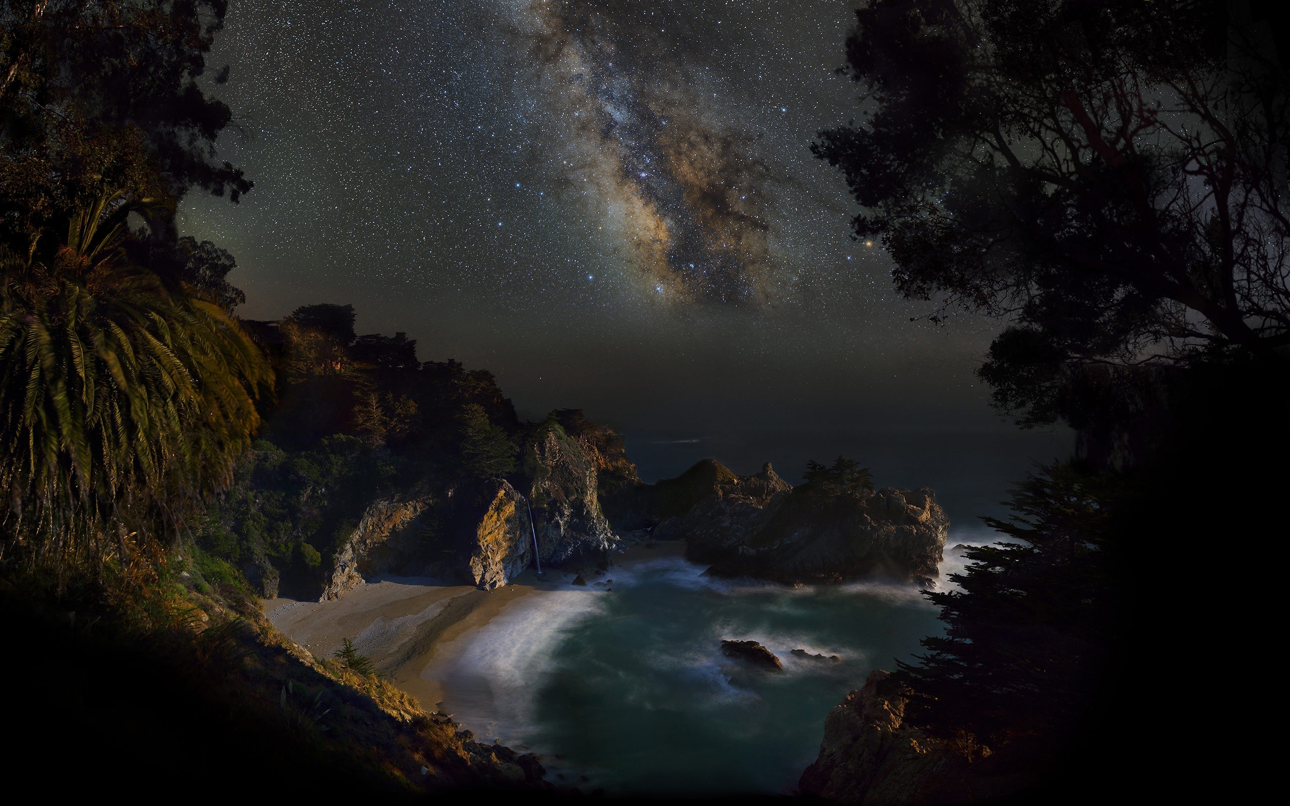 Description: A night sky with stars and a milky over a beach and ocean with trees and rocks on the shore.