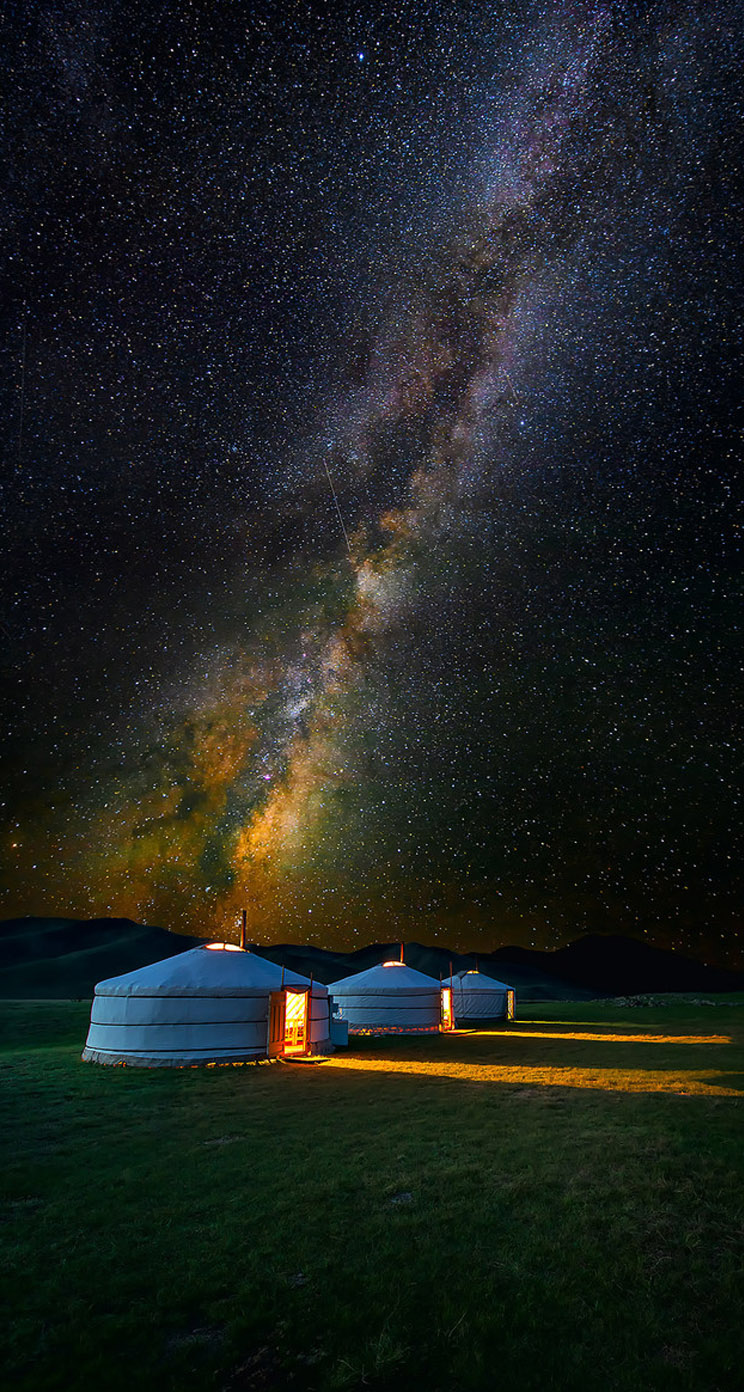 Description: A night sky with stars and a milky in the background with a couple of yurts in the foreground.