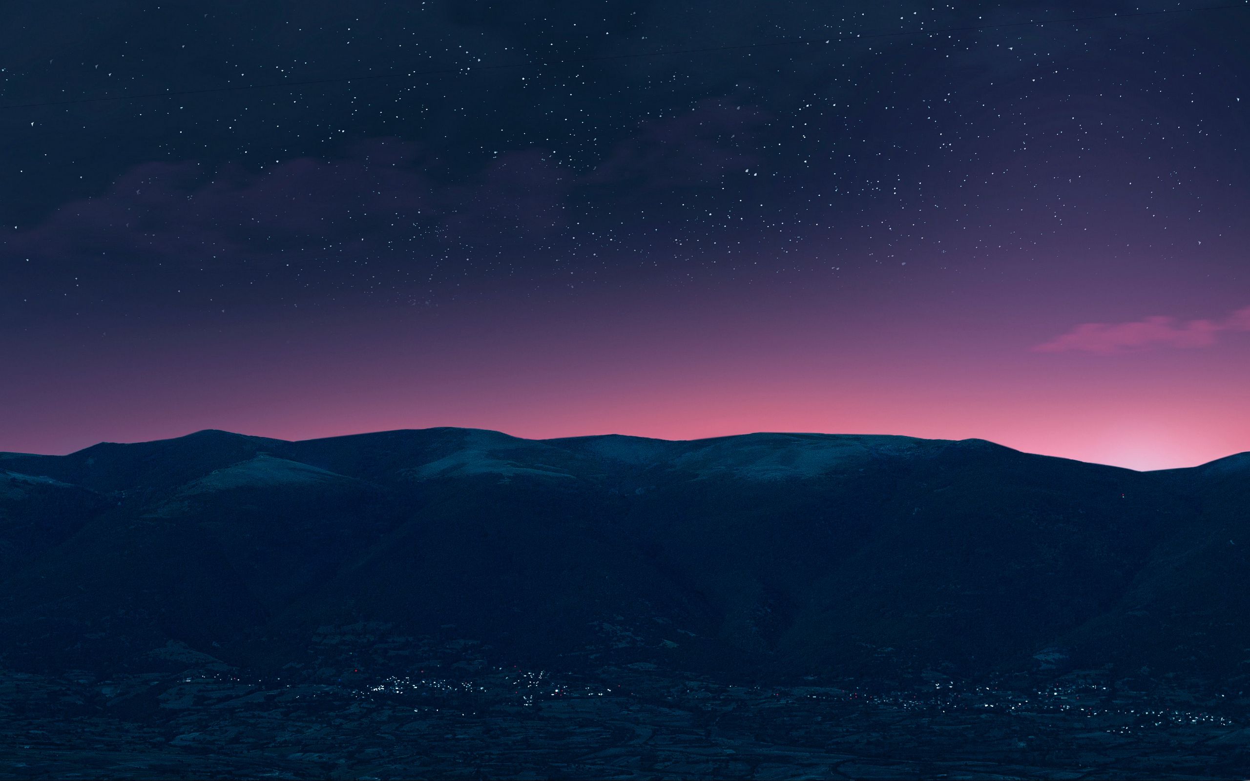 Description: A night sky with a mountain range in the background and a pink and blue sky with stars above it.