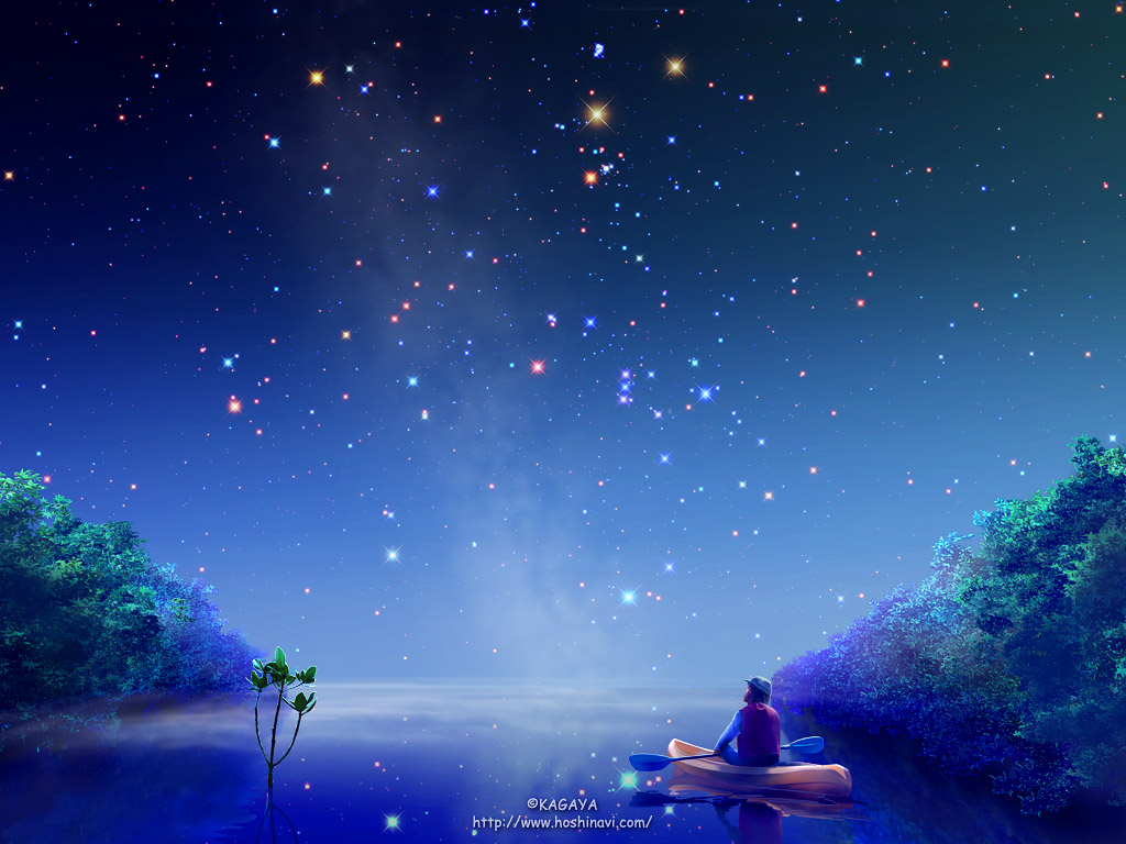 Description: A man sitting on a boat in the water under a night sky filled with stars and a lot of stars.