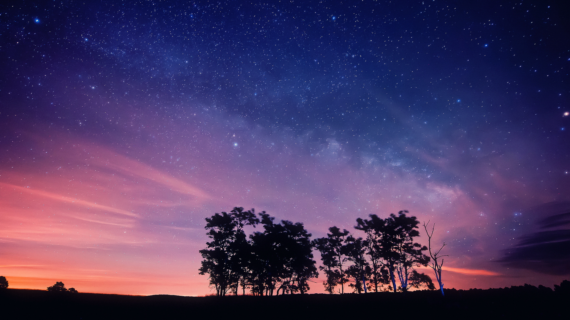 Description: A night sky with stars and trees silhouetted against a purple and blue sky with stars and clouds and a few clouds.