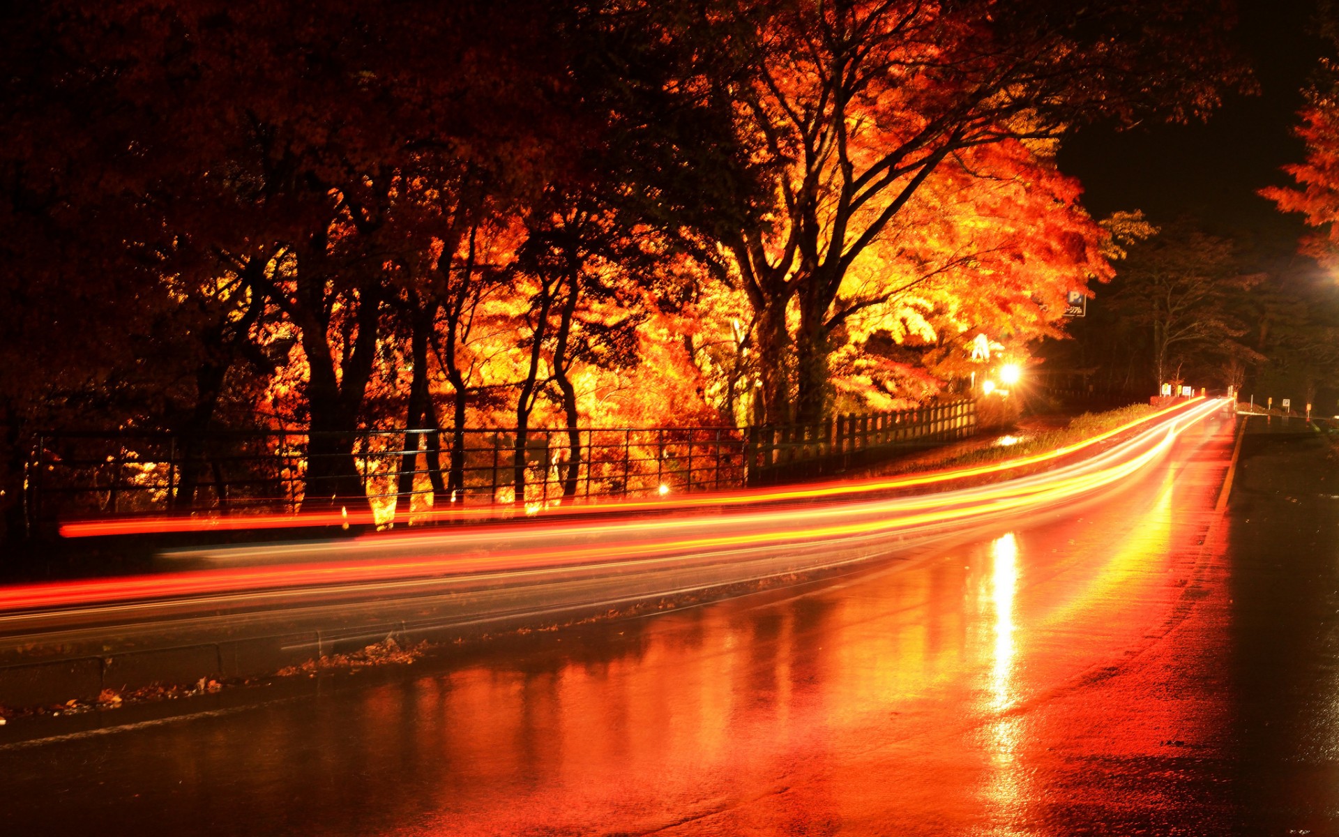 Description: A street with a fence and trees with lights on it at night time with a car passing by on the road.