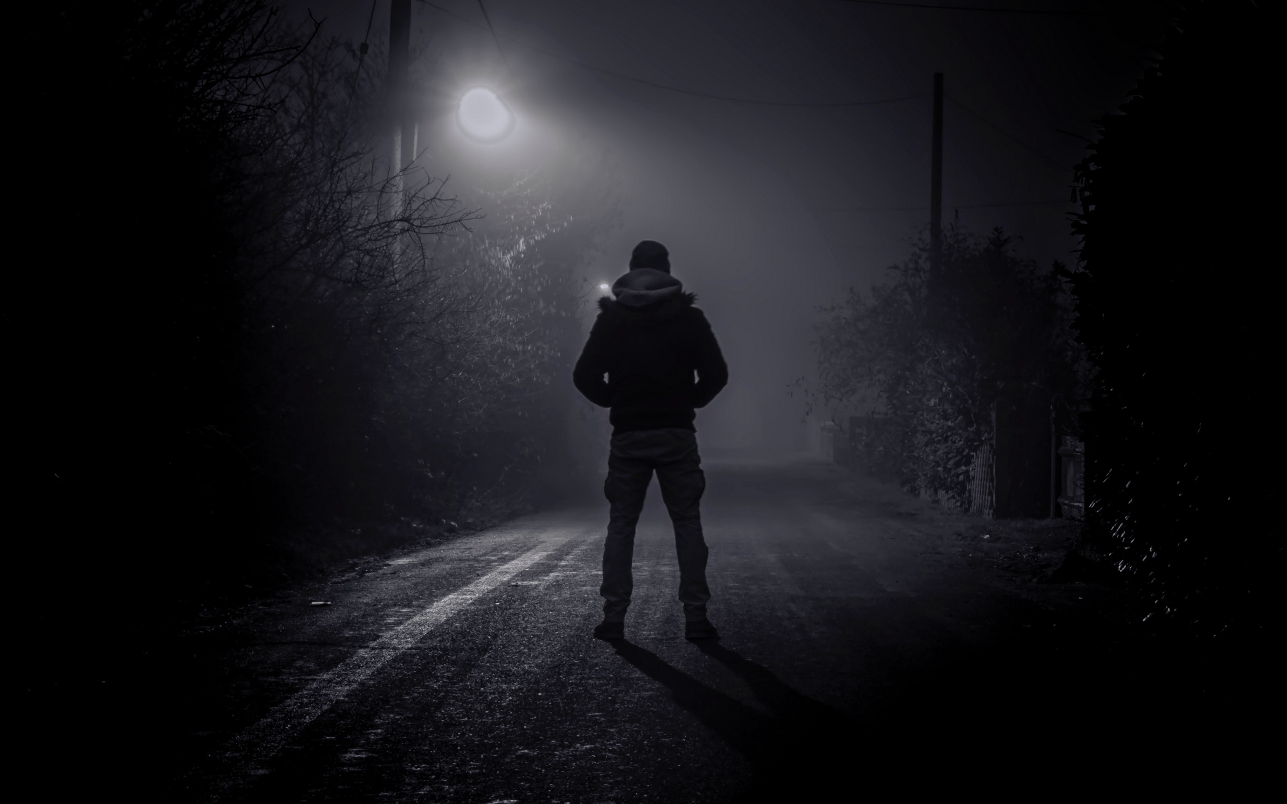 Description: A person standing on a street at night with a street light in the background and fog in the air.