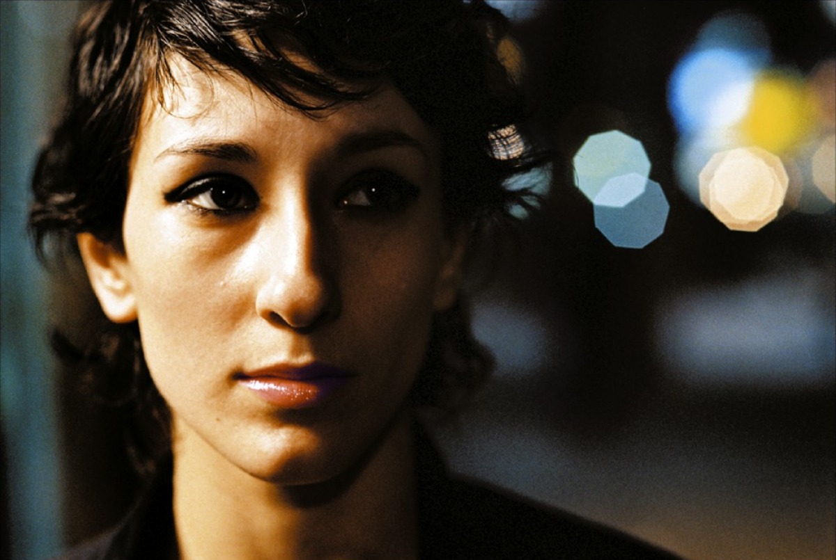 Description: A woman with dark hair and a black jacket on a street corner at night with lights in the background.
