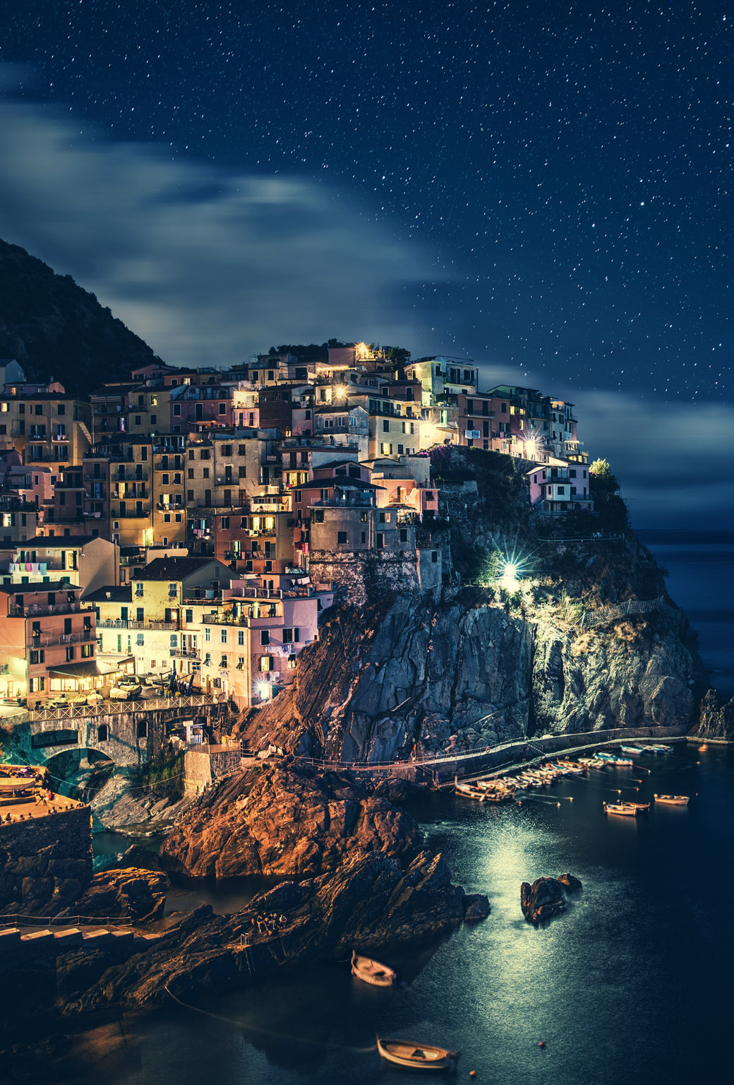 Description: A night view of a town on a cliff with boats on the water and a bridge going over it.