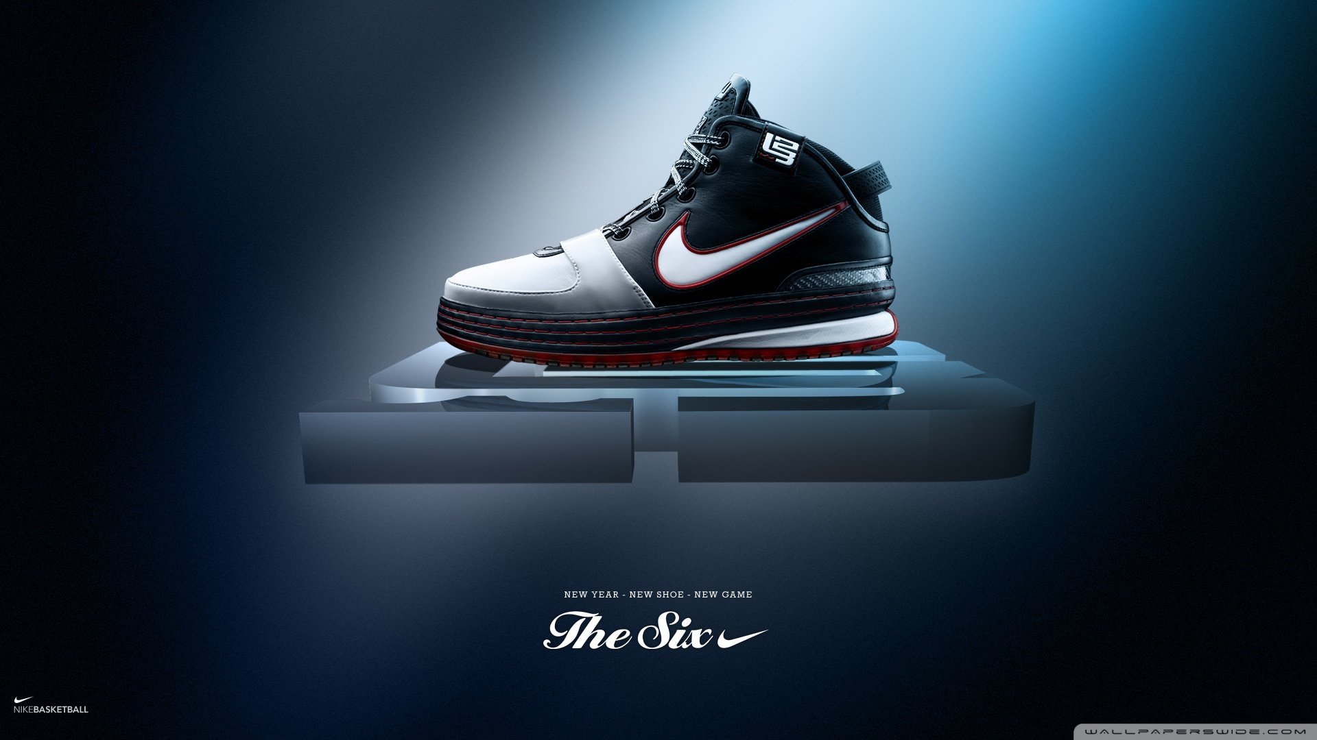 Description: A nike shoe is on a display with a blue background and a black and white background with a red and white nike logo.