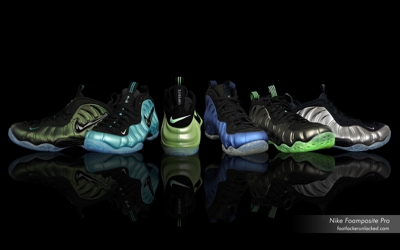 Description: A group of nike shoes sitting on top of a black surface with a reflection of them on the floor.