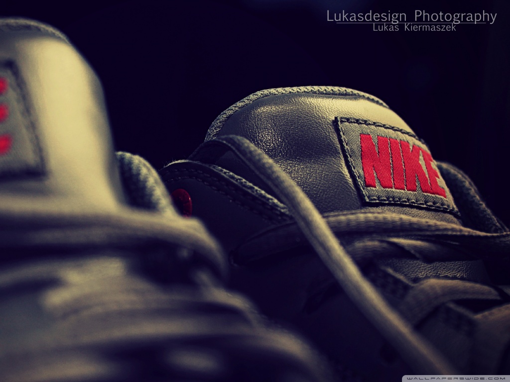 Description: A pair of nike sneakers with a red nike patch on the side of the shoe.