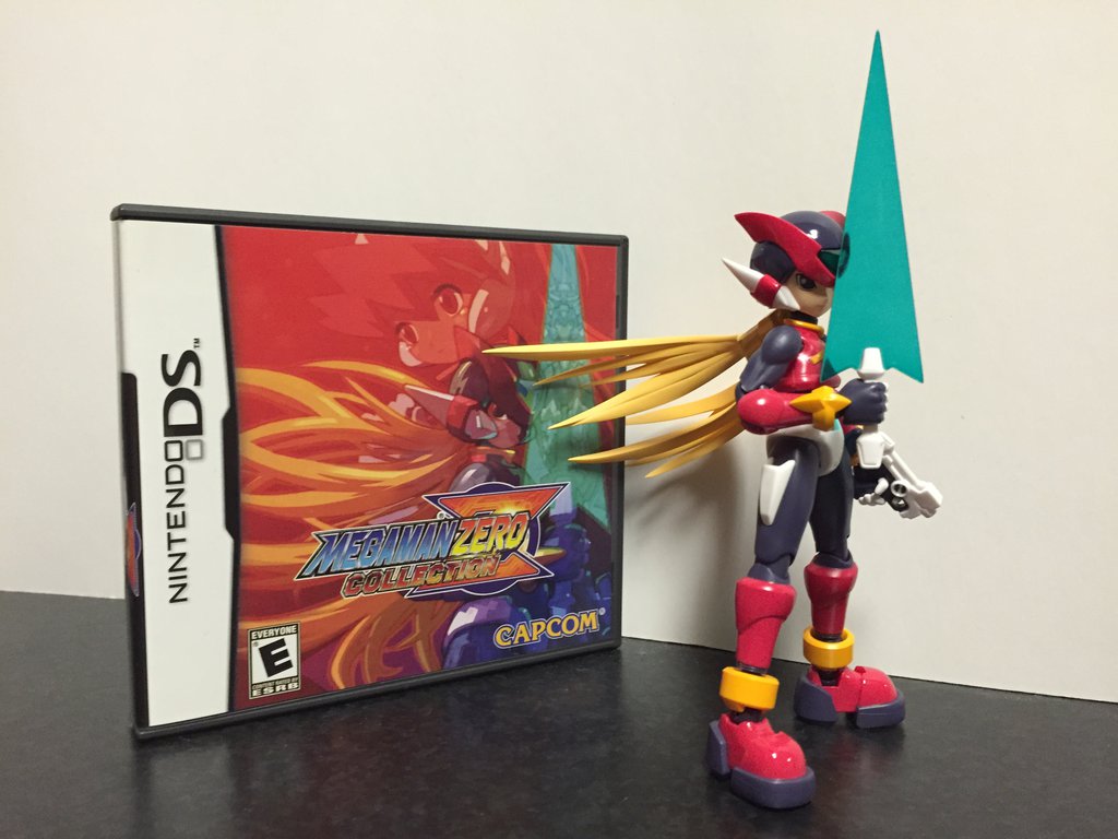 Description: A nintendo game with a character next to it on a table with a nintendo 3ds game case on it.