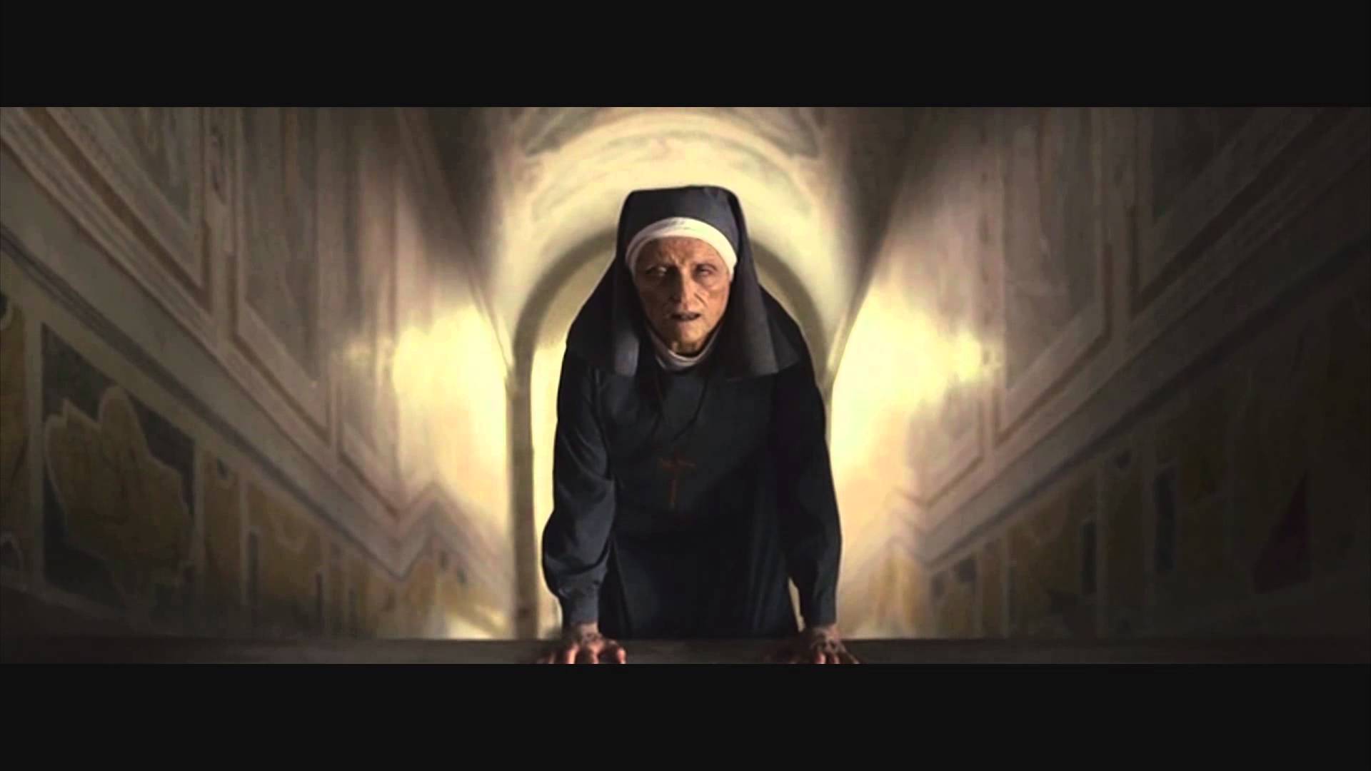 Description: A nun in a dark room with a light coming from her head and hands on her knees.