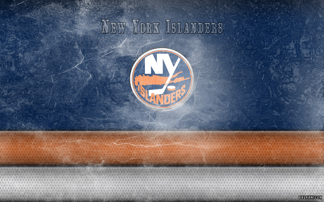 Description: A new york islanders logo on a blue background with a red stripe and a white stripe on the bottom of the image.