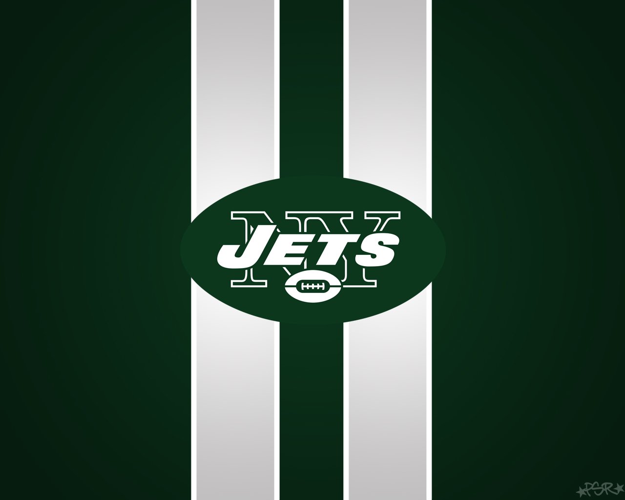 Description: A new york jets logo on a green background with white stripes and a football helmet on the side of the logo.
