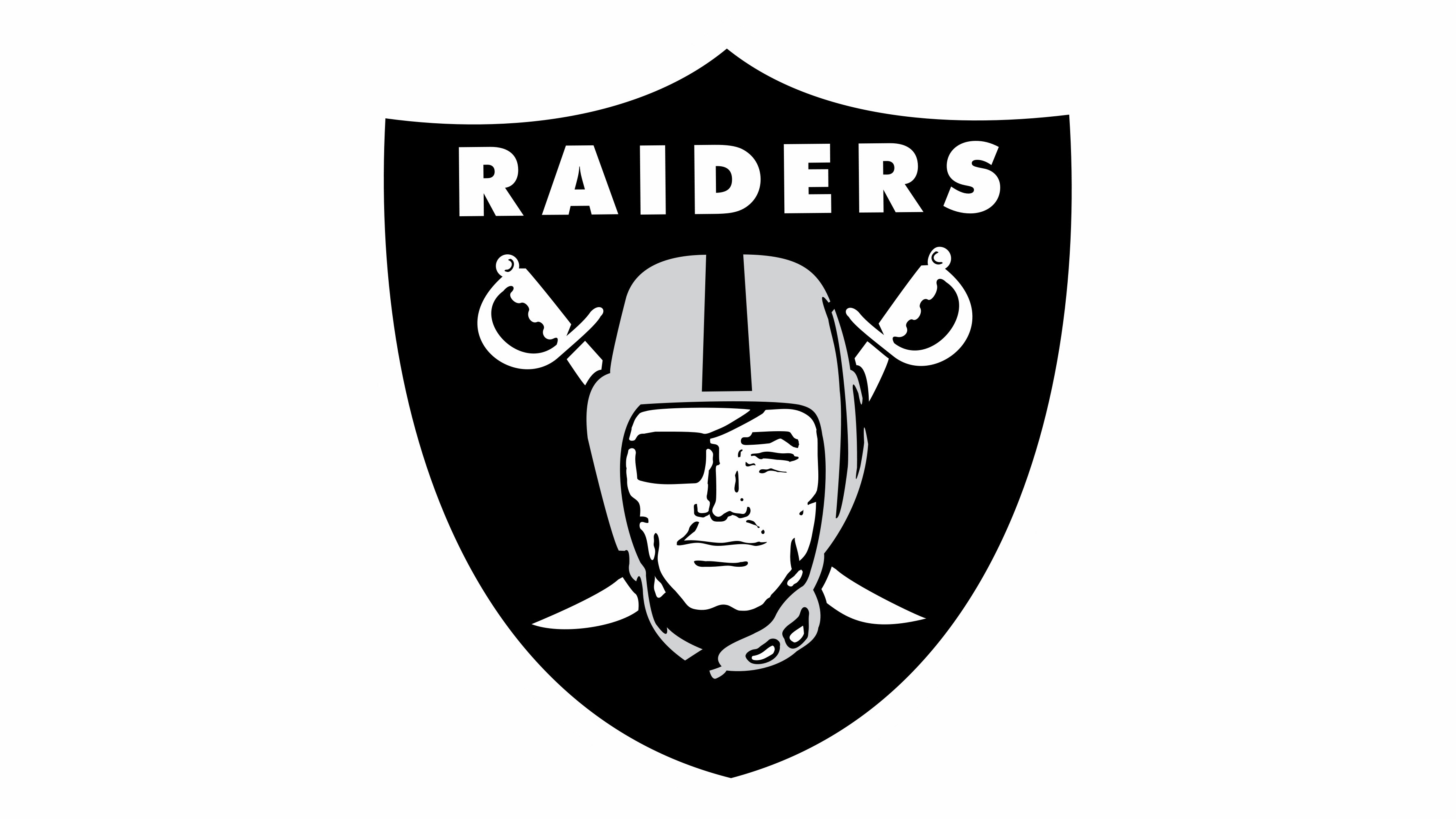 Description: A black and white oakland football logo with a helmet on it's face and the oakland logo on the side of the shield.