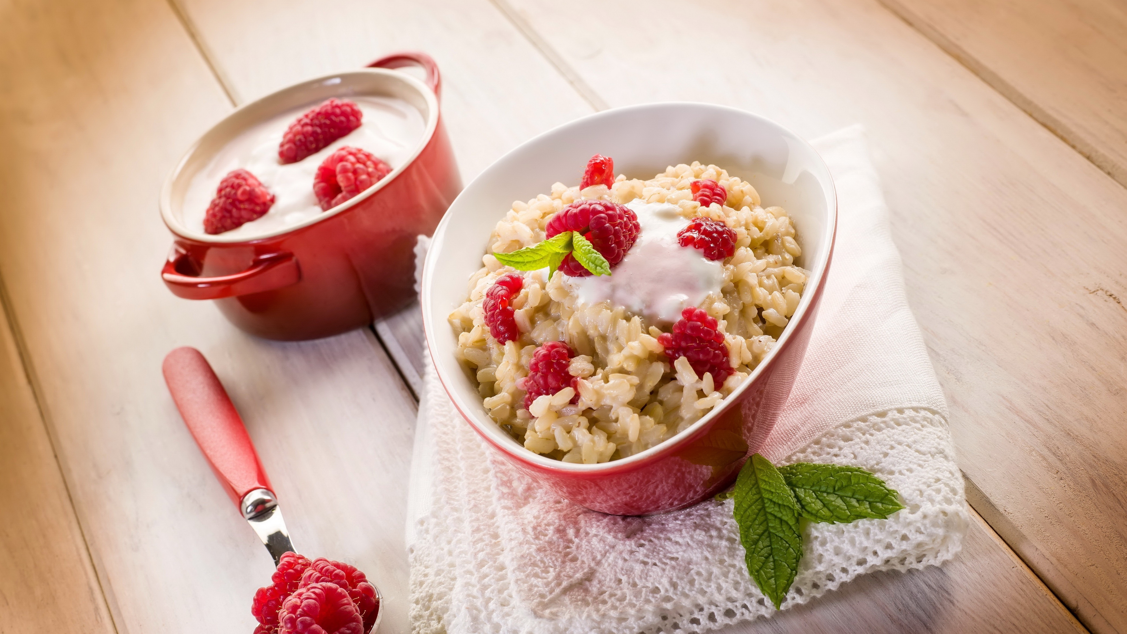 Description: A bowl of oatmeal with raspberries and yogurt on a towel next to a red pot.