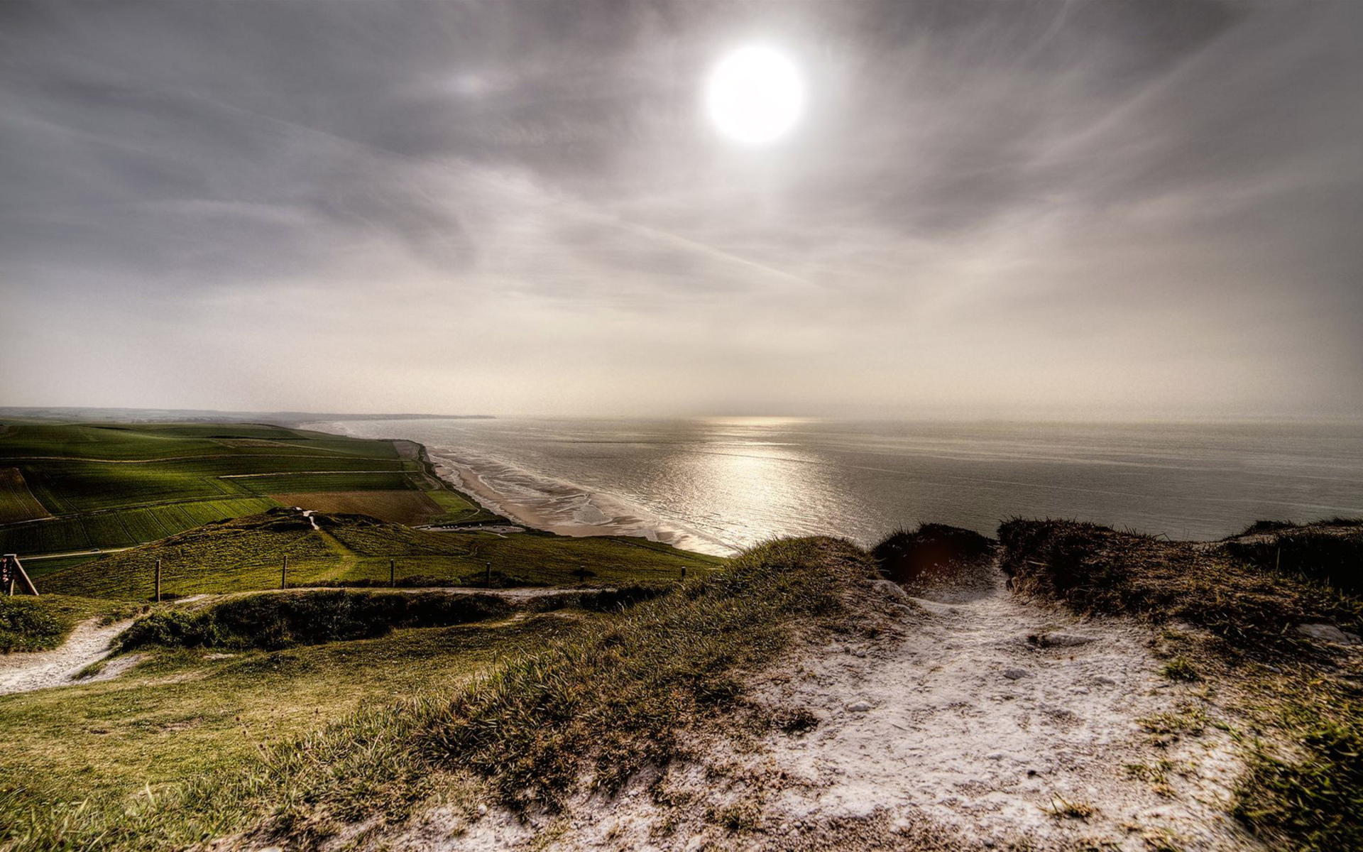 Description: A path leading to the ocean on a cloudy day with the sun shining over the water and the grass.