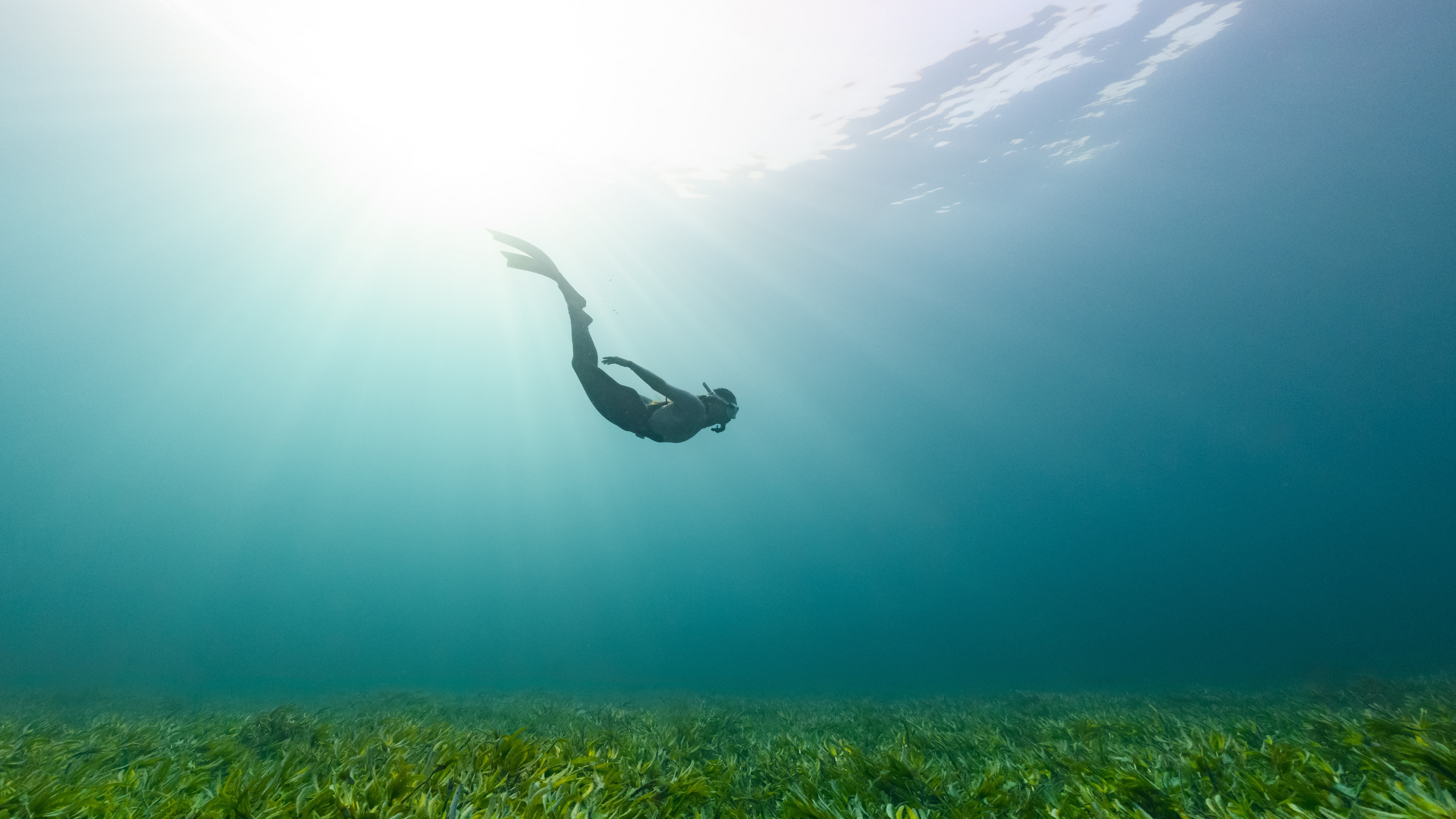 Description: A person swimming in the ocean with the sun shining through the water's waterline and grass in the foreground.
