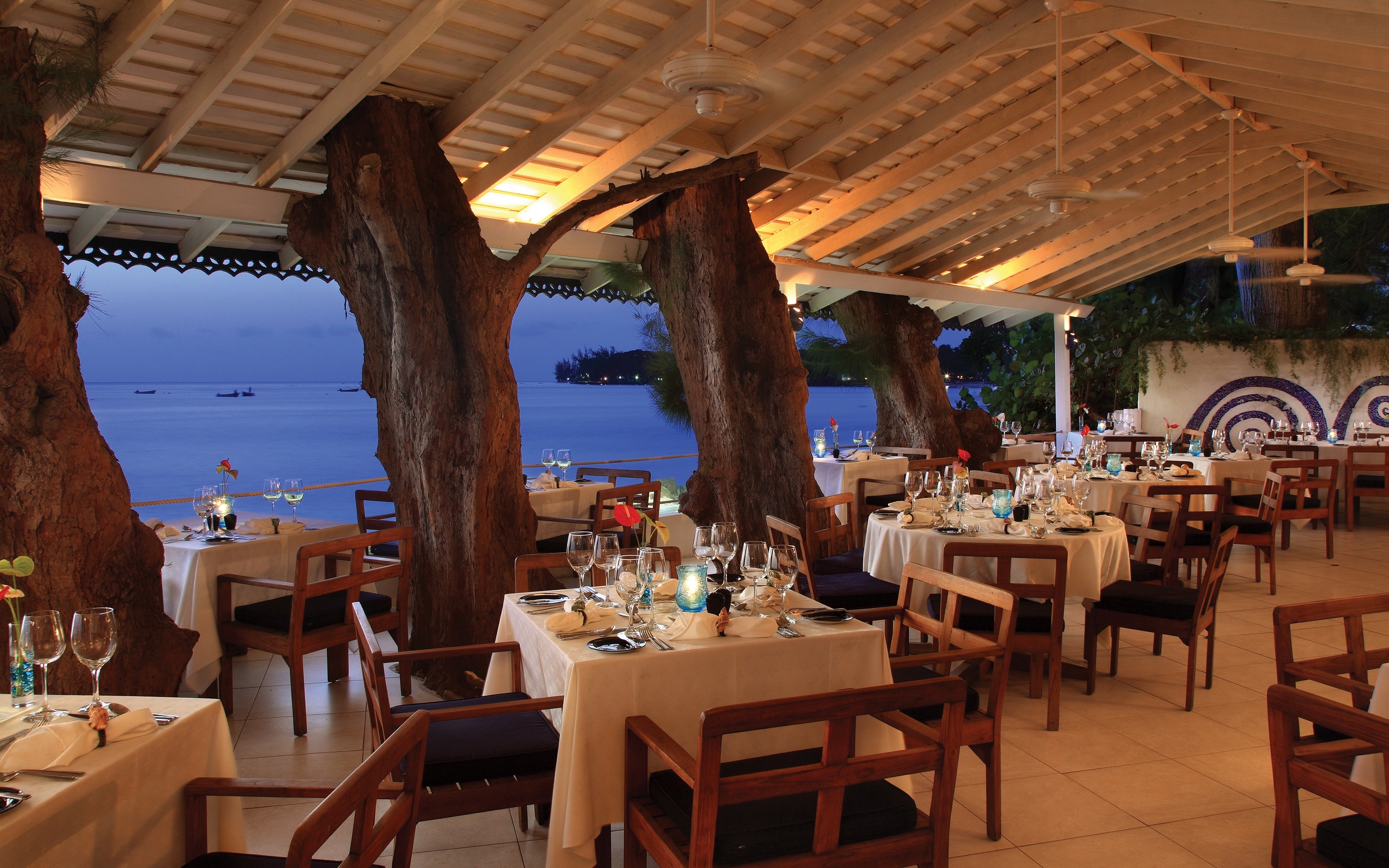 Description: A restaurant with tables and chairs and a view of the ocean and trees in the background at night time.