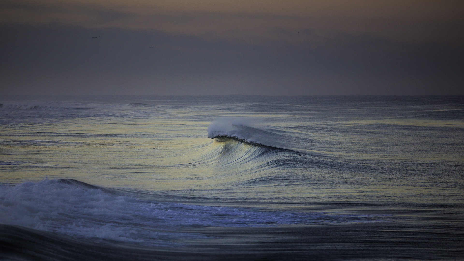 Description: A wave is breaking in the ocean at sunset or dawn.