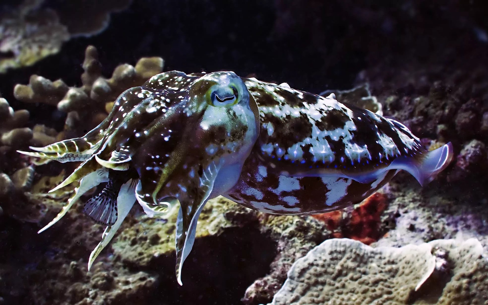 Description: A large octopus is swimming in the water near corals and sponges of corals on the ocean floor.