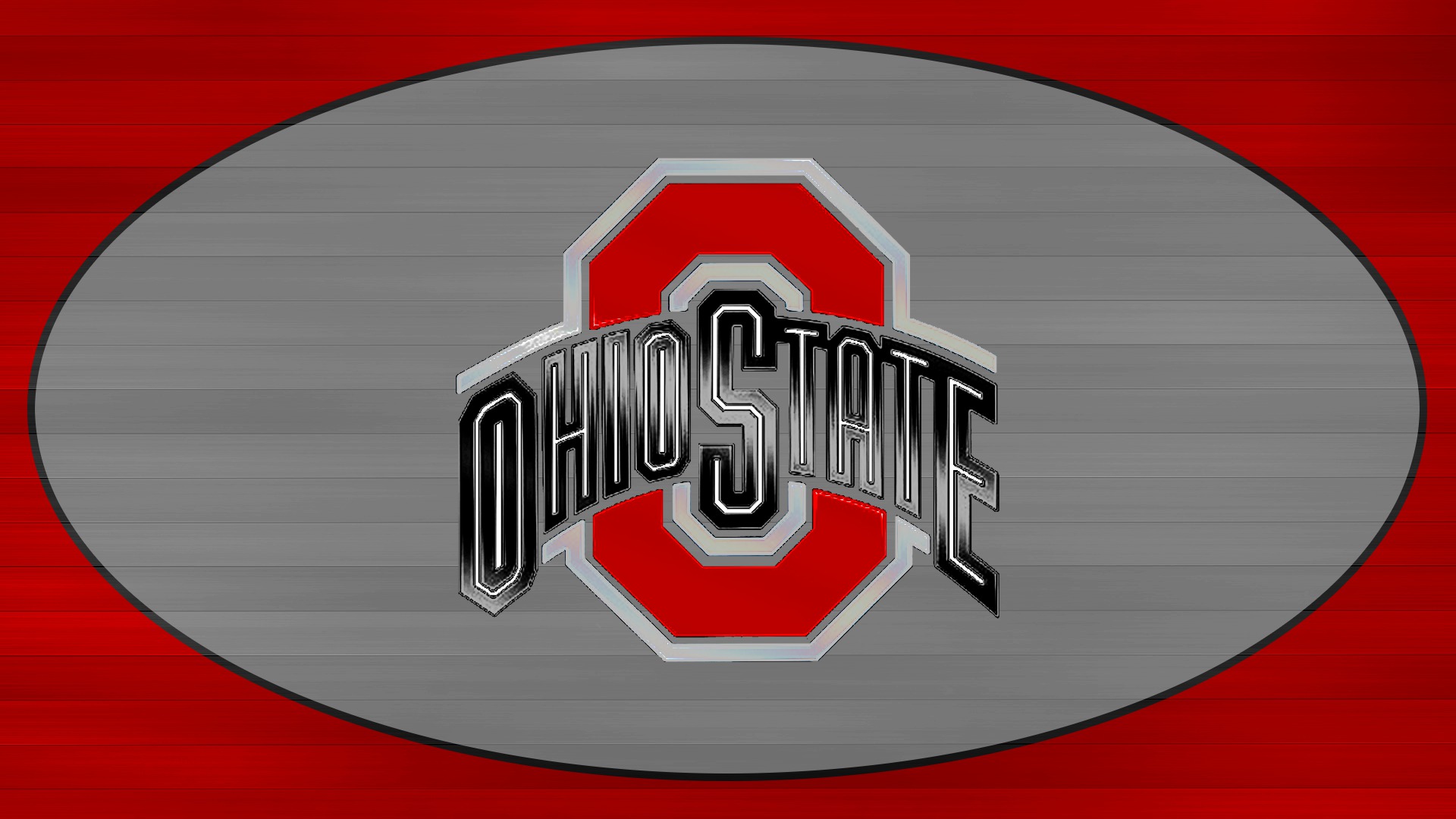 Description: A metal sign with the word ohio state on it in a circle on a red background with a black and white stripe.