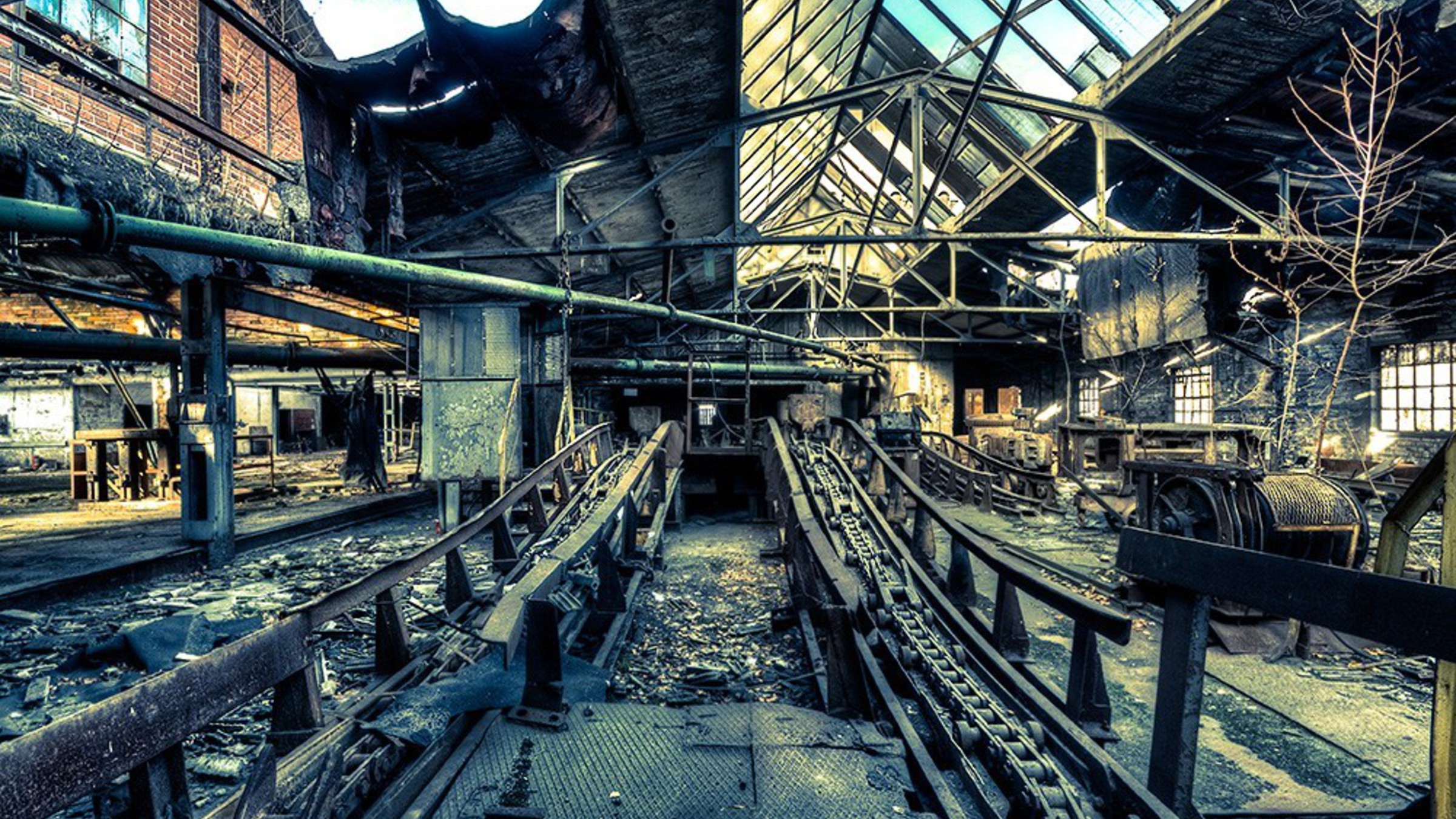 Description: A very old building with a lot of windows and a lot of rust on the ground and floor and a clock.