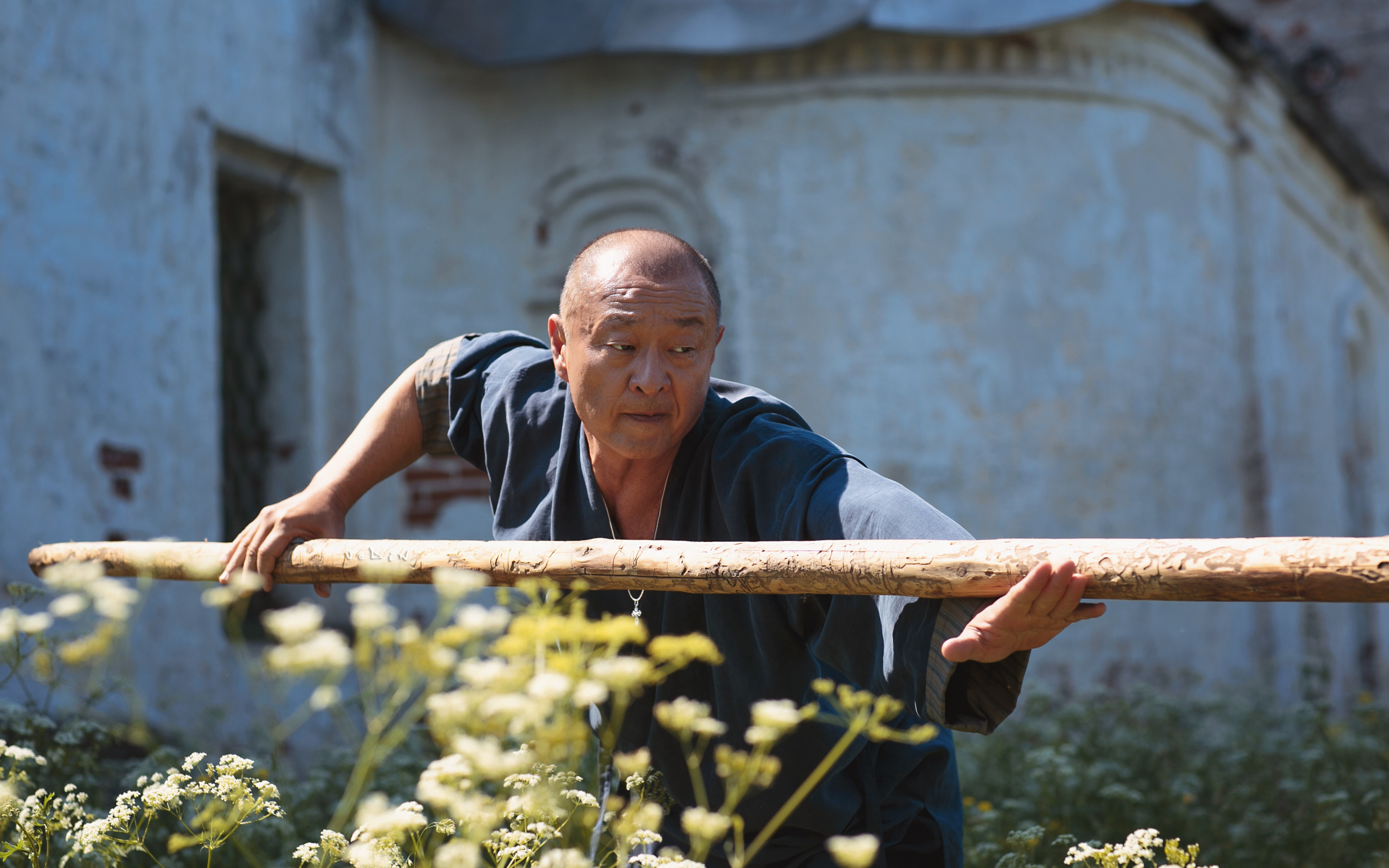 Description: A man carrying a wooden stick in a field of flowers and weeds in front of a building with a round window.