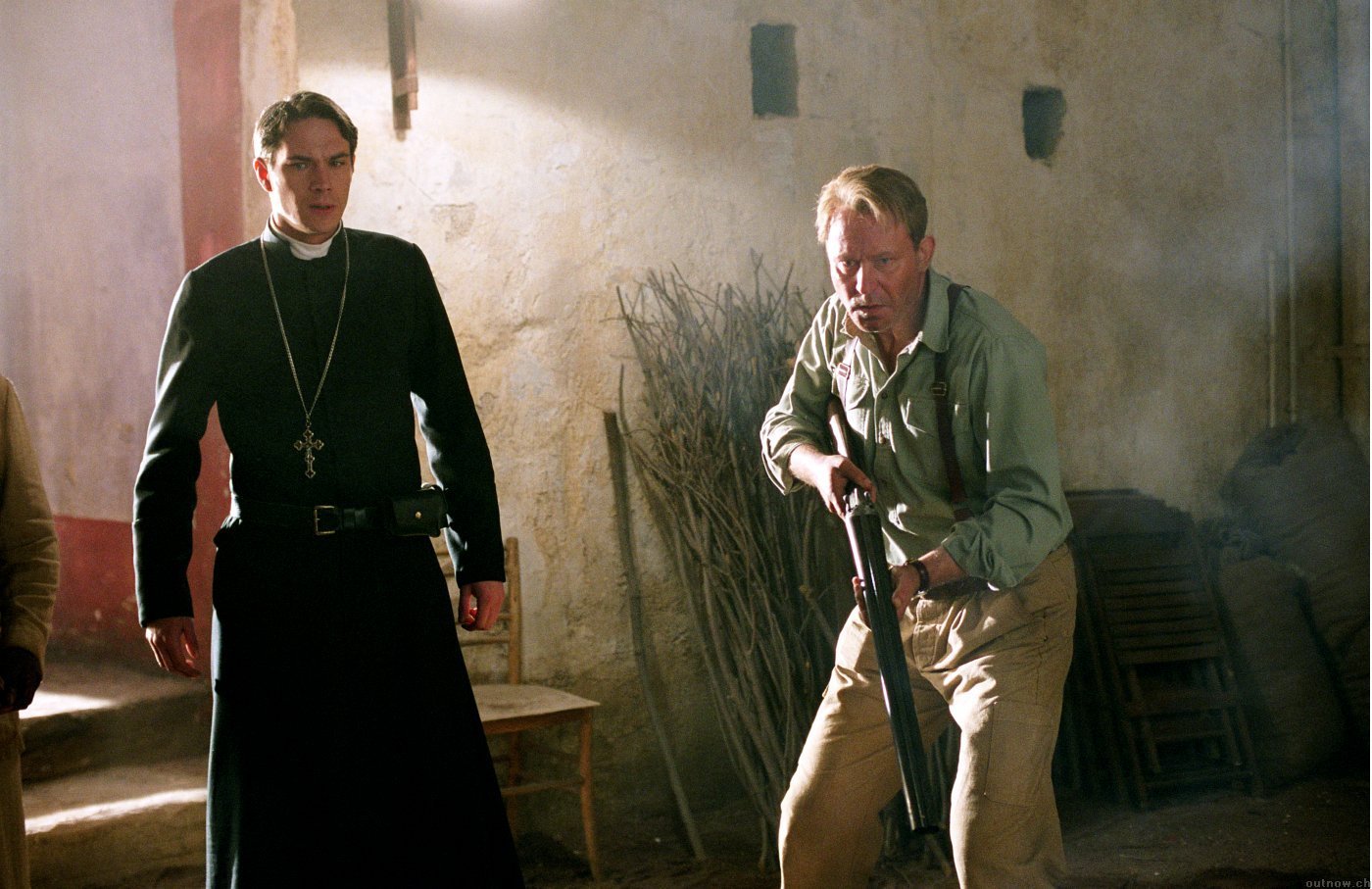 Description: A man holding a gun while standing next to another man in a room with a cross on it's neck.