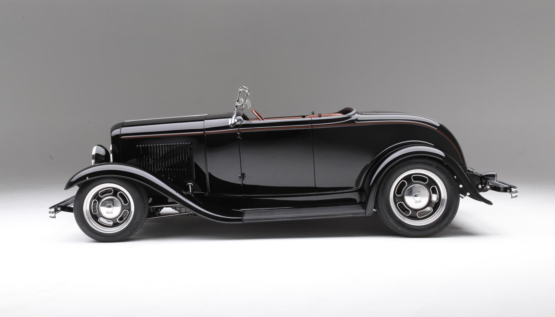 Description: An old model car is shown in black and white colors.