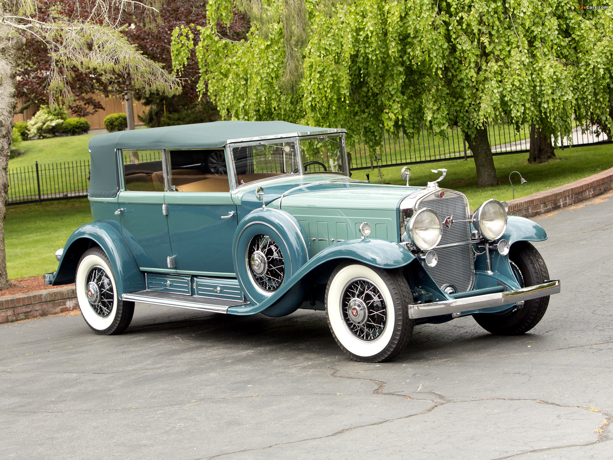 Description: An old model car is parked on the street in front of a tree lined park area with a fence.