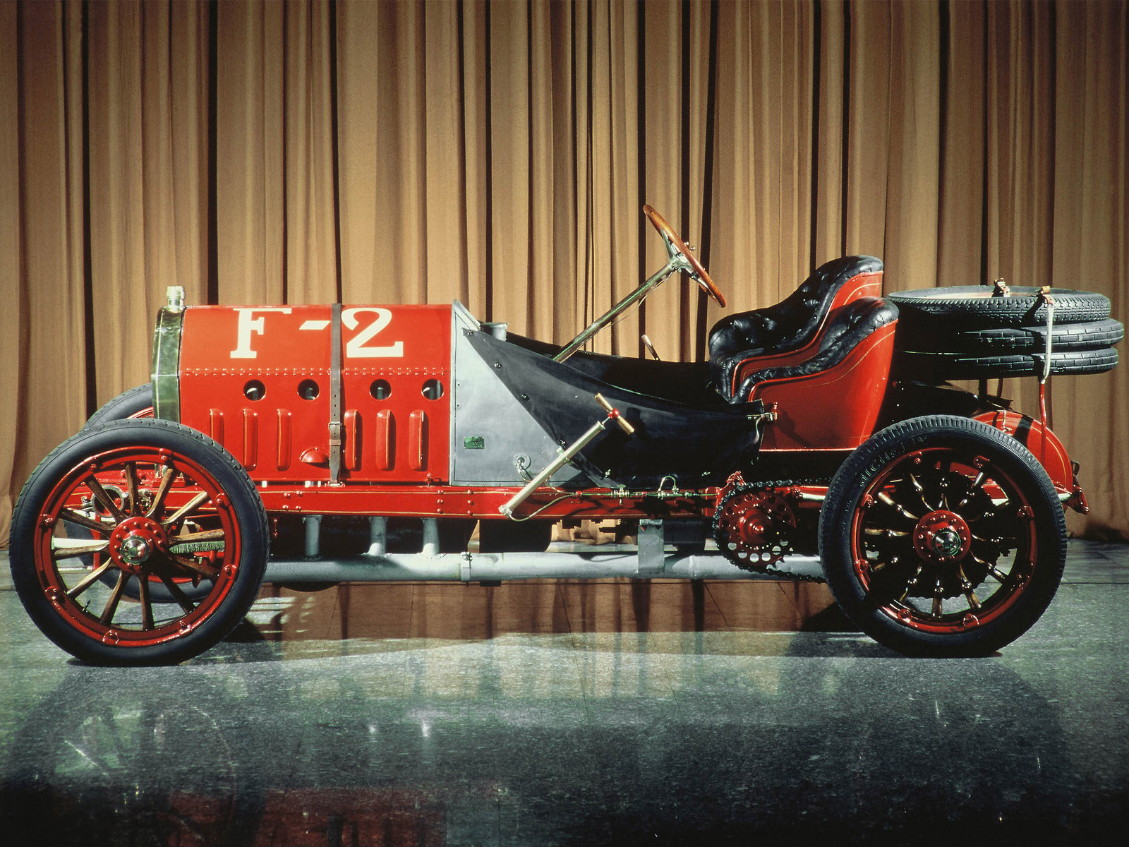 Description: An old model t car is on display in a museum setting with a curtain behind it and a number on the side.