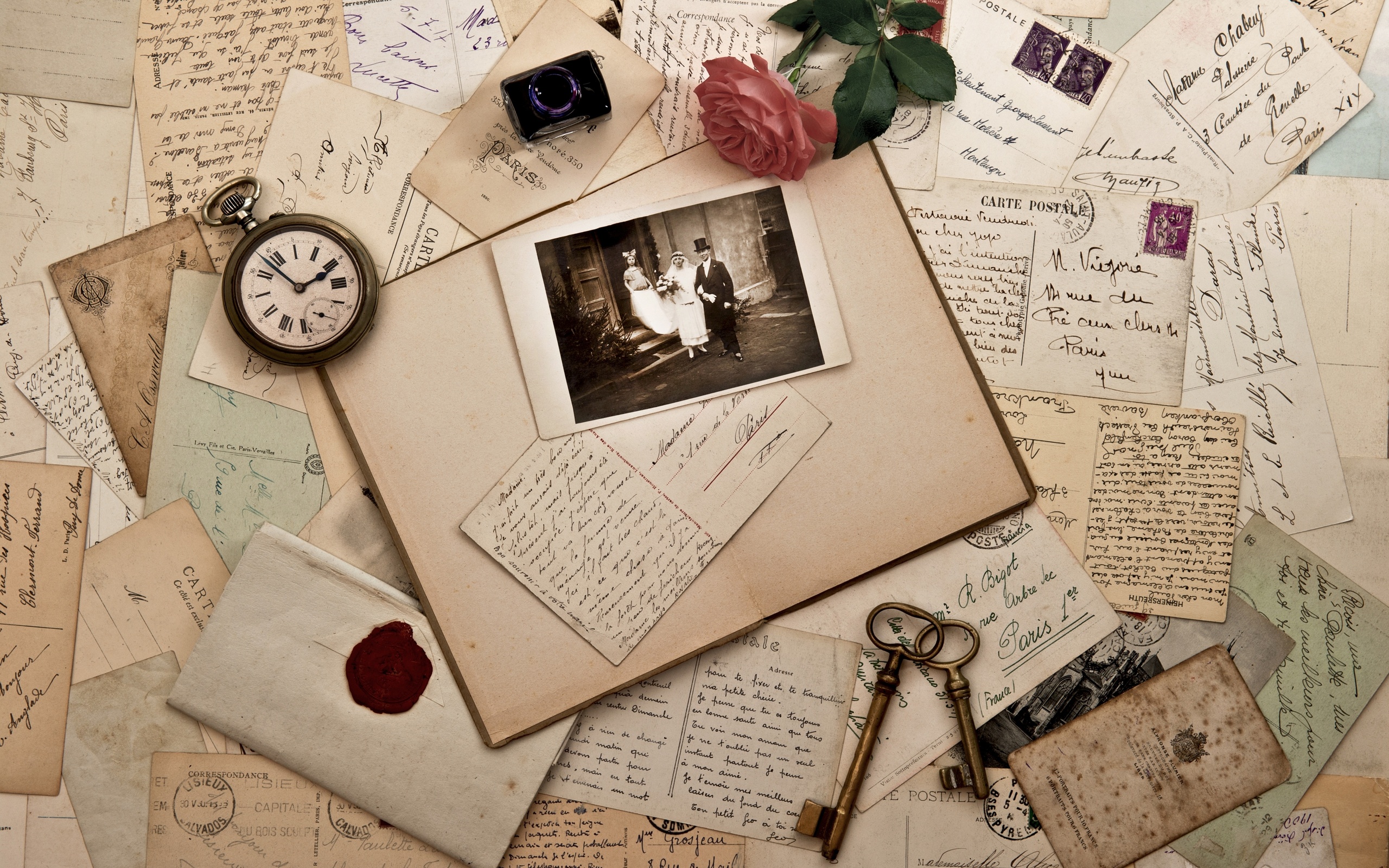 Description: A bunch of old papers and a clock on a table with a rose and a rose on top of it.