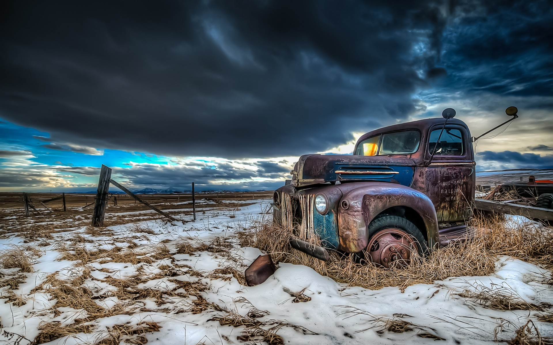 Description: An old truck sitting in a snowy field under a cloudy sky with a fence in the foreground and a field with snow on the ground.