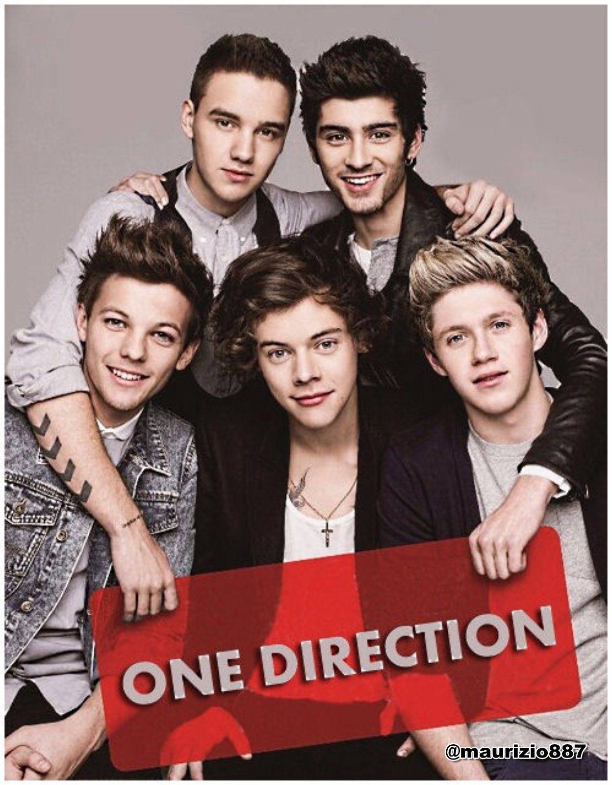 Description: One direction poster with four young men holding a sign that says one direction on it and a red ribbon.