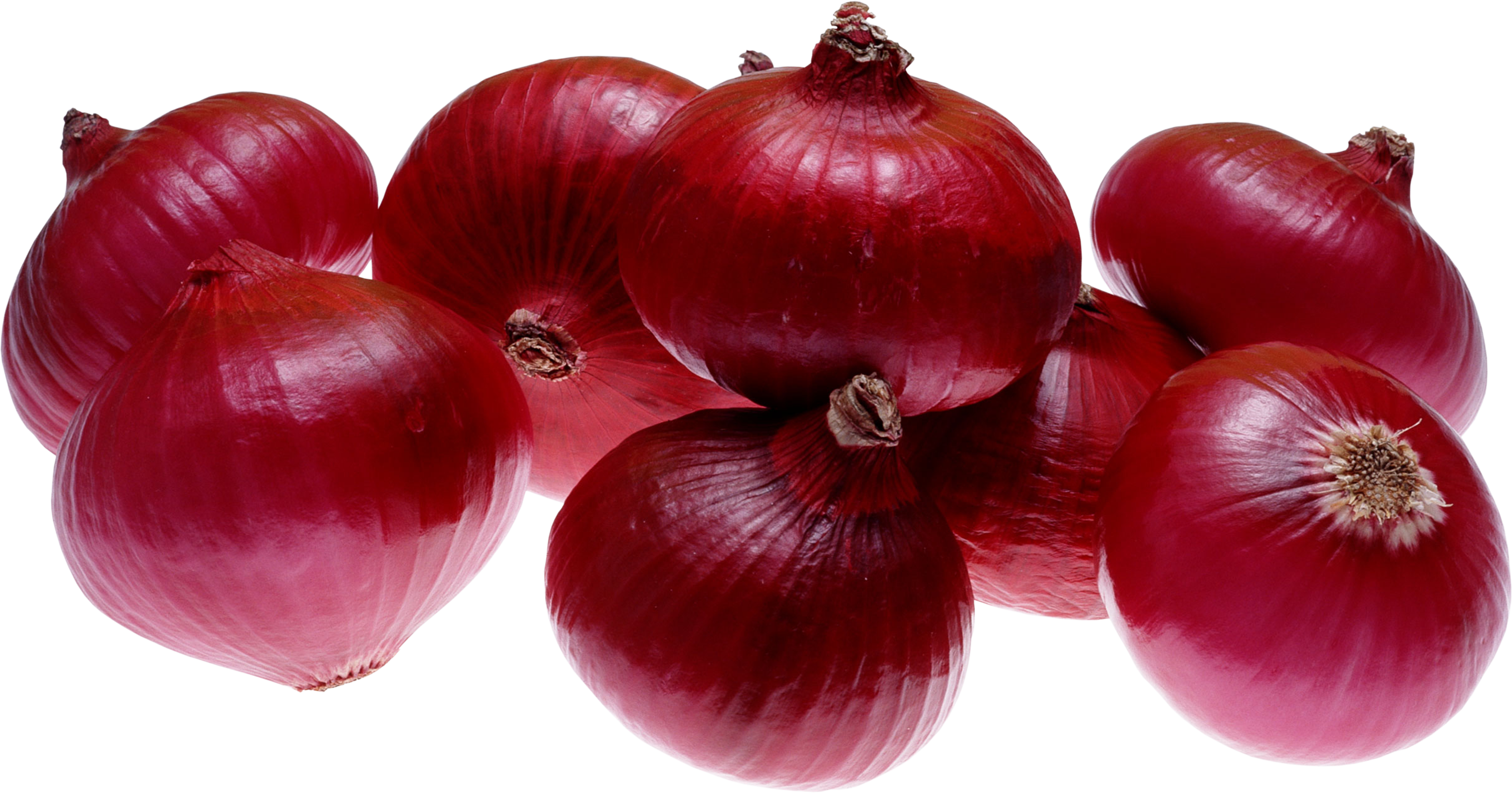 Description: A group of onions sitting on top of each other on a white surface with a white background and a few red onions.