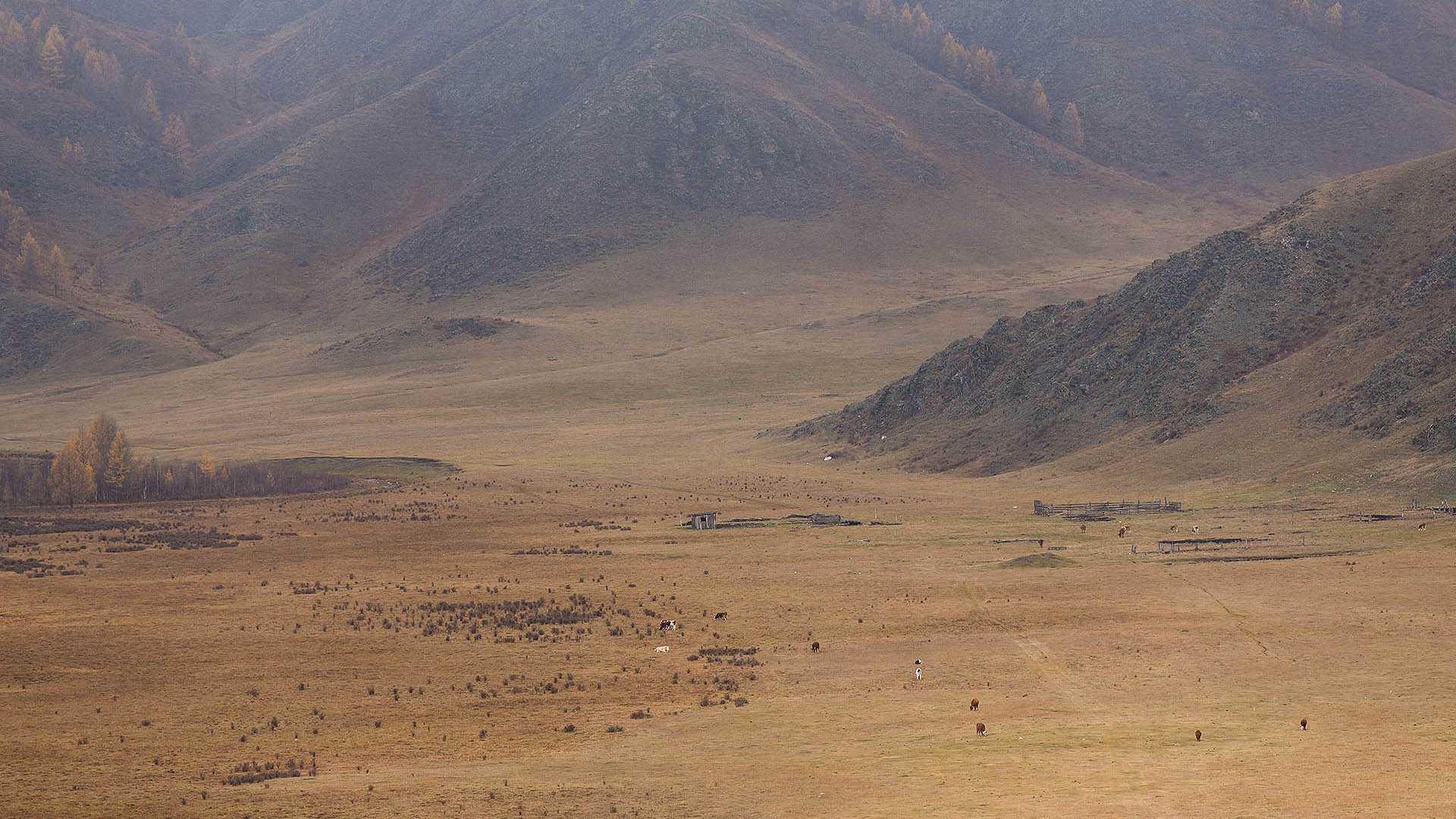 Description: A large open field with a mountain in the background and a few people walking around it in the distance.