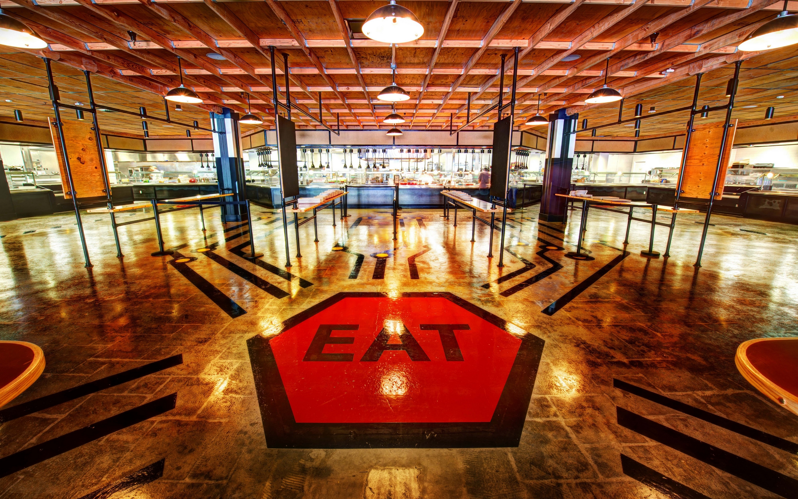 Description: A large open room with a red eat sign in the middle of it and a red light hanging from the ceiling.