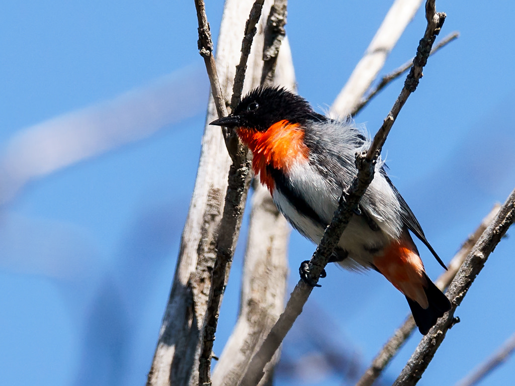 Description: A bird with an orange and black head sitting on a tree branch with no leaves on it's branches.