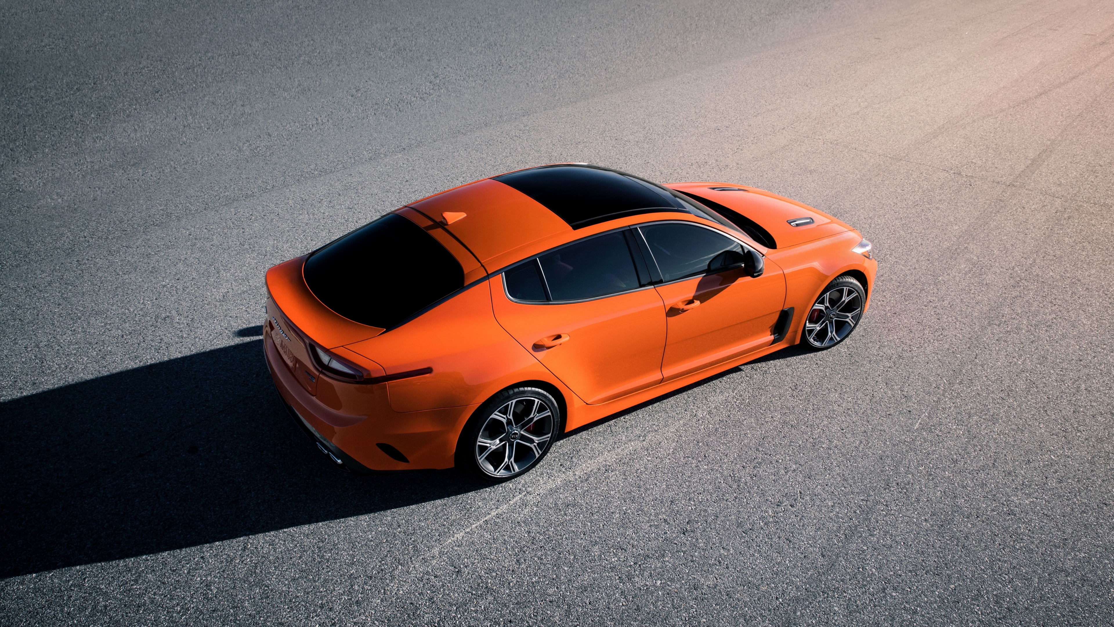 Description: An orange car is driving down a road with a black roof and a black top on it's side.