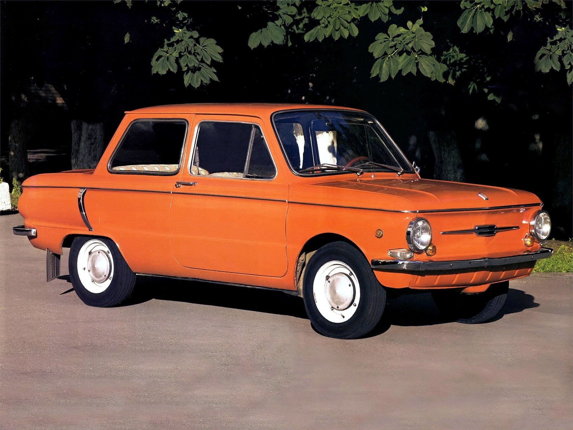 Description: An orange car parked in a parking lot next to a tree and bushes in the background with a black background.
