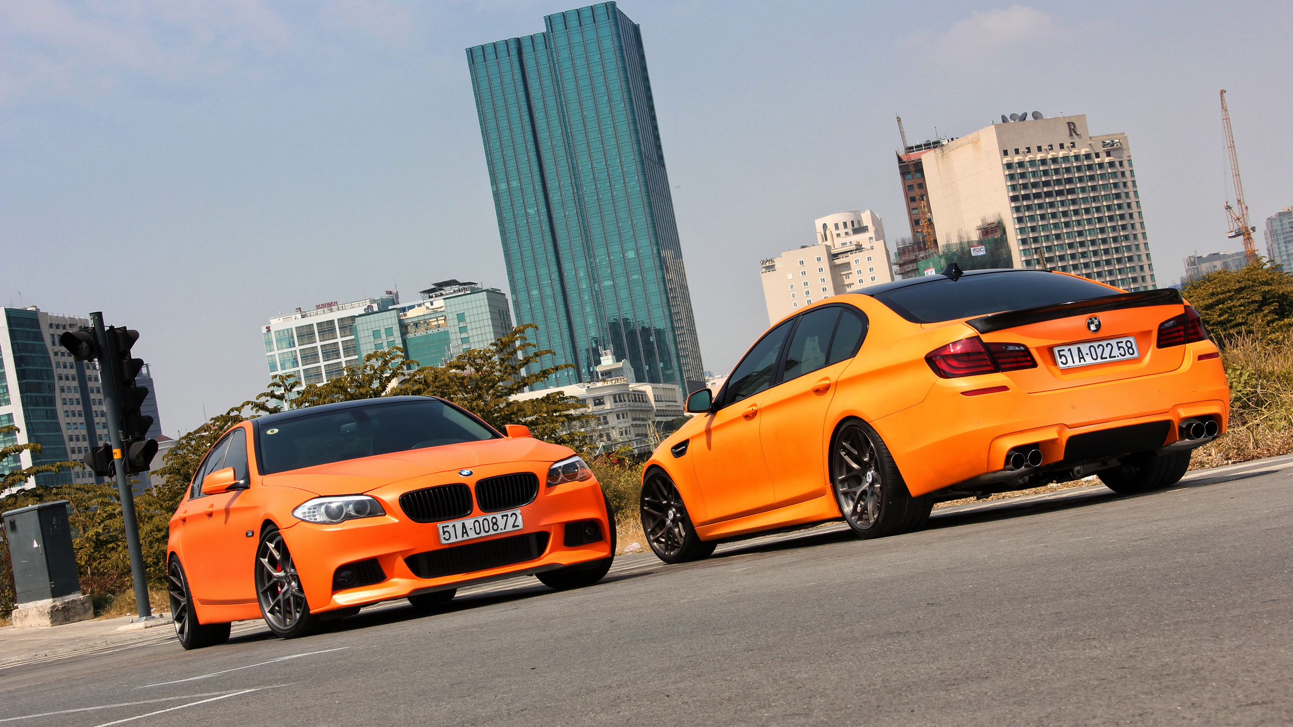 Description: Two orange cars parked next to each other on a street with tall buildings in the background and a traffic light.