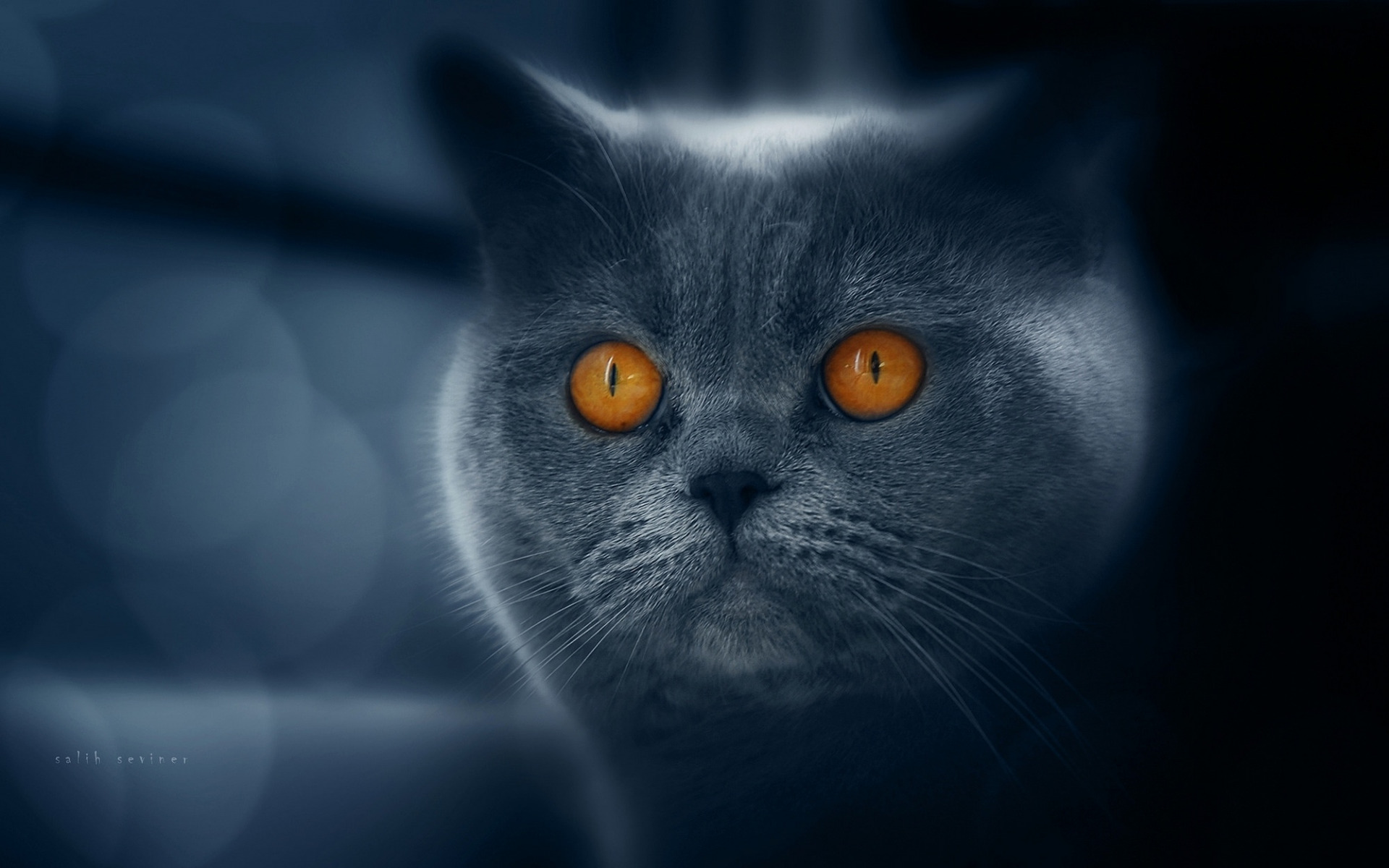 Description: A cat with orange eyes staring at the camera with a blurry background behind it and a blurry background behind it.